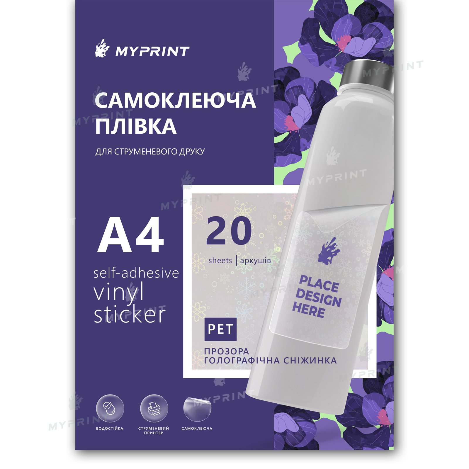 Self-adhesive film for inkjet printing My Print PET Snowflake waterproof, A4, 20 sheets, transparent holographic snowflake (11366)