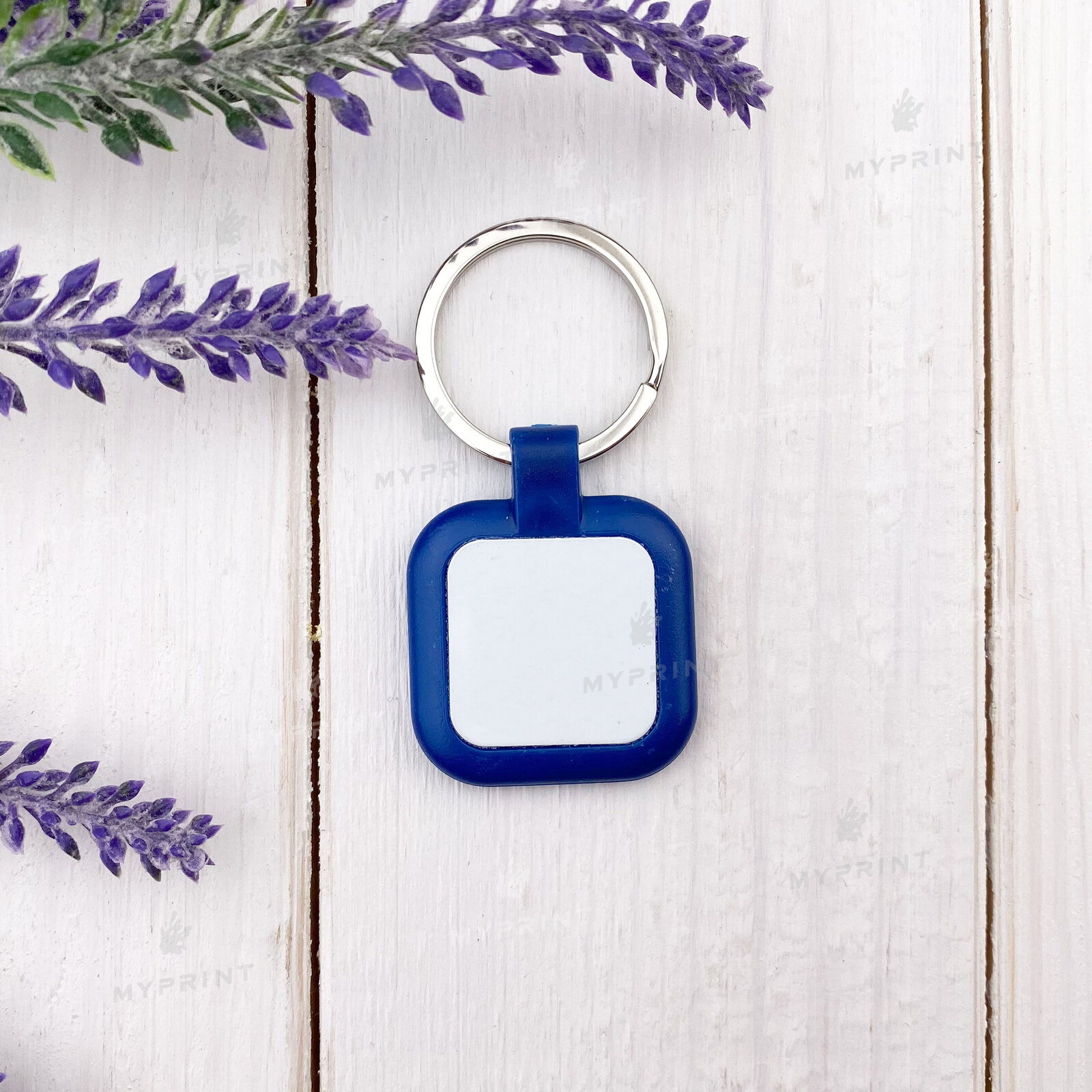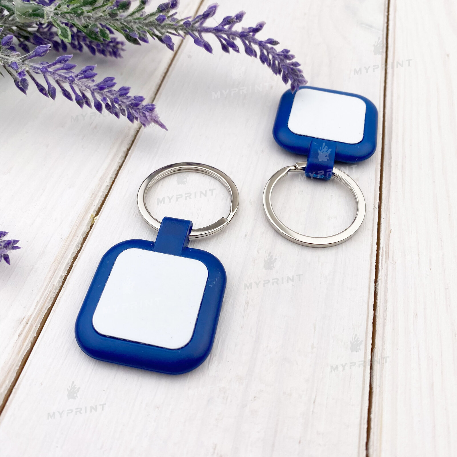 The process is complete. Keychain for sublimation plastic two-sided square blue 25*25 mm is now not just a blank, but a finished product with a unique image or photo.
