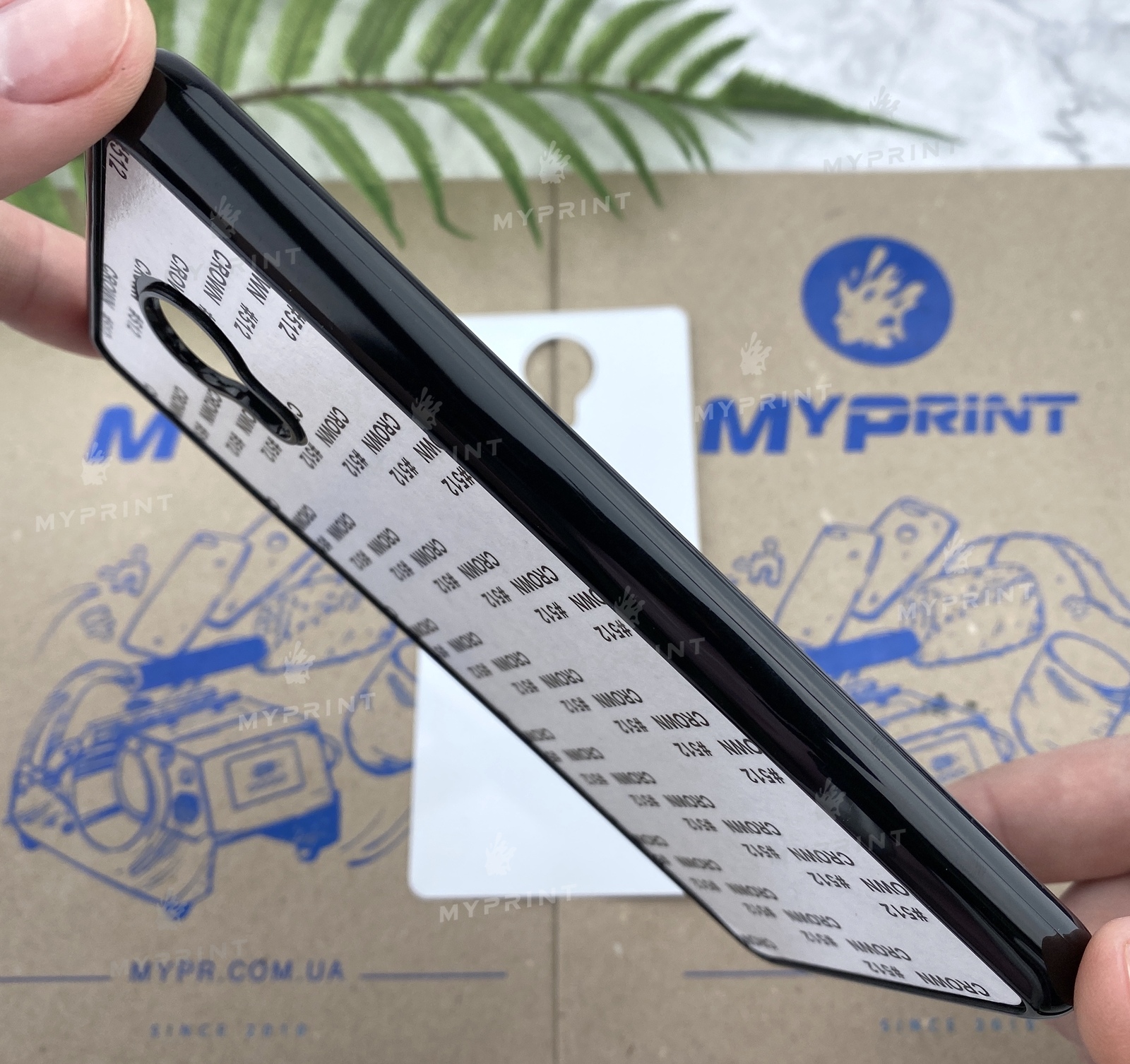 - Remove the protective film from the case blank, under which a layer of adhesive is applied, and attach the plate to the case.