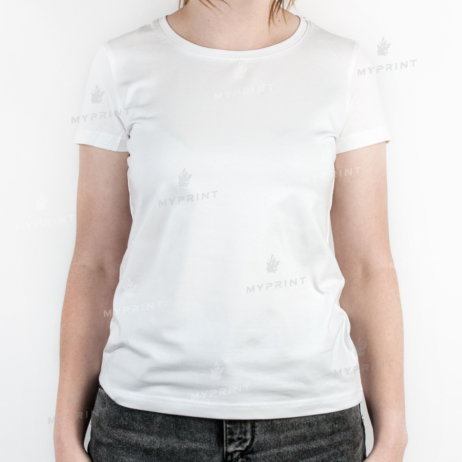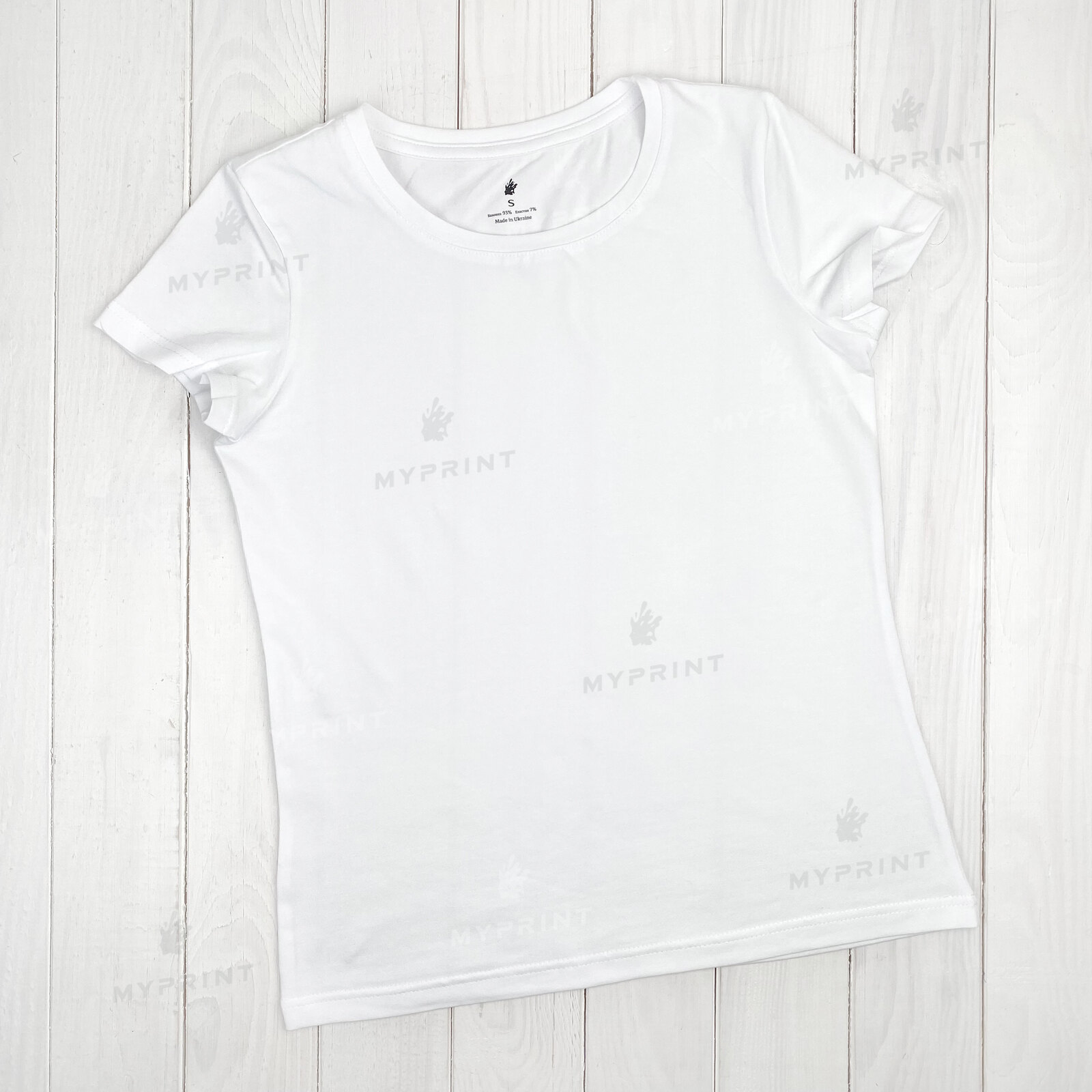 The process is complete. T-shirt women's cotton/elastane 170 g/m², white, L (8028) is now not just a blank, but a finished product with a unique image or photo.