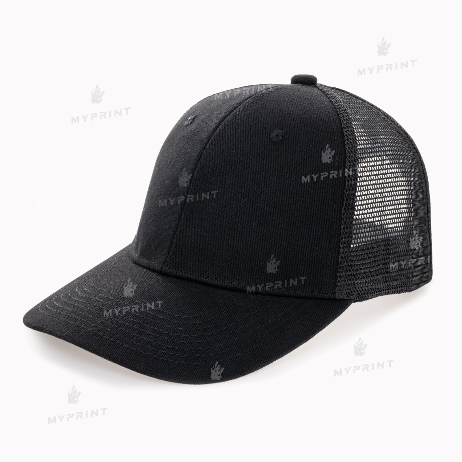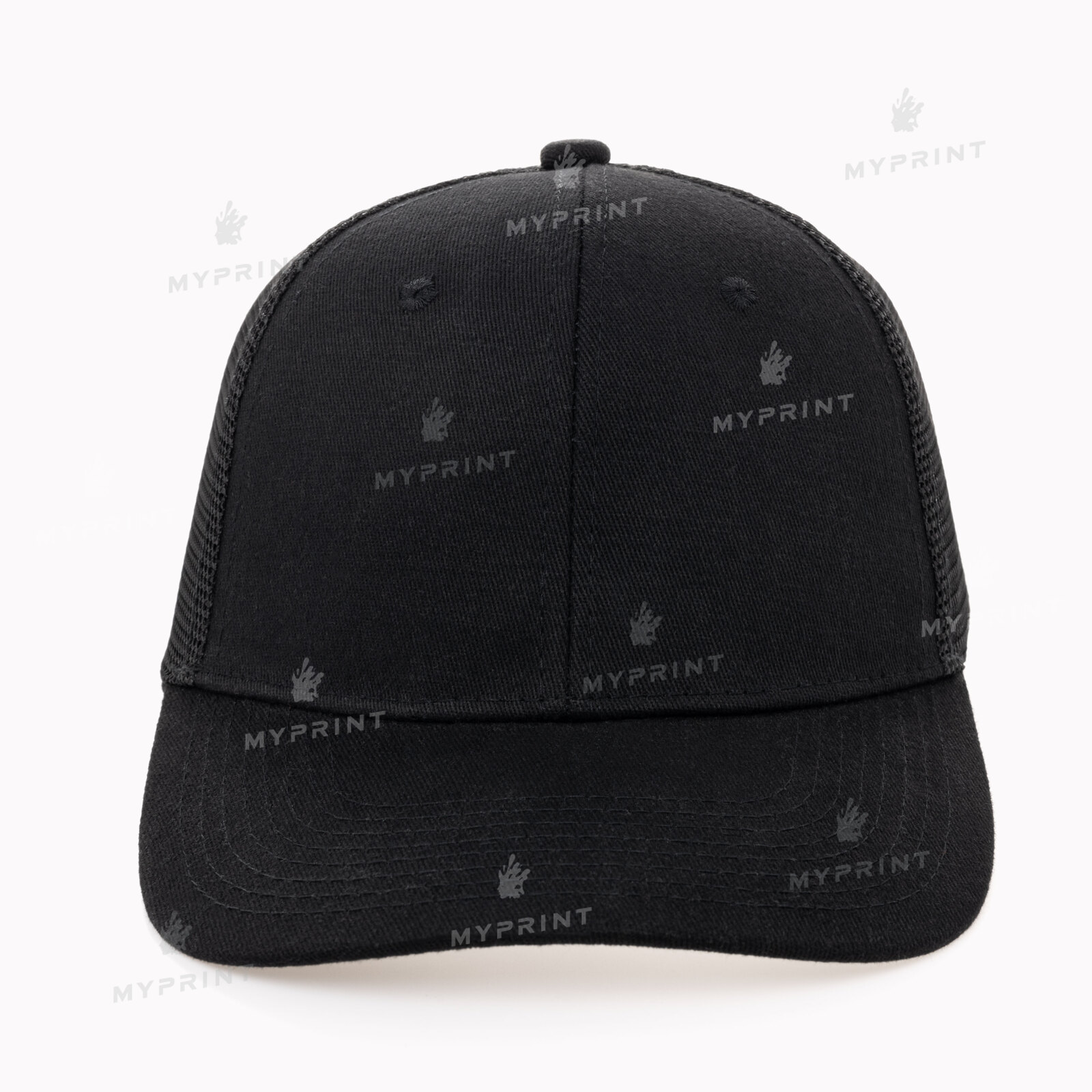 - Six-piece cap for thermal transfer cotton black with black mesh.