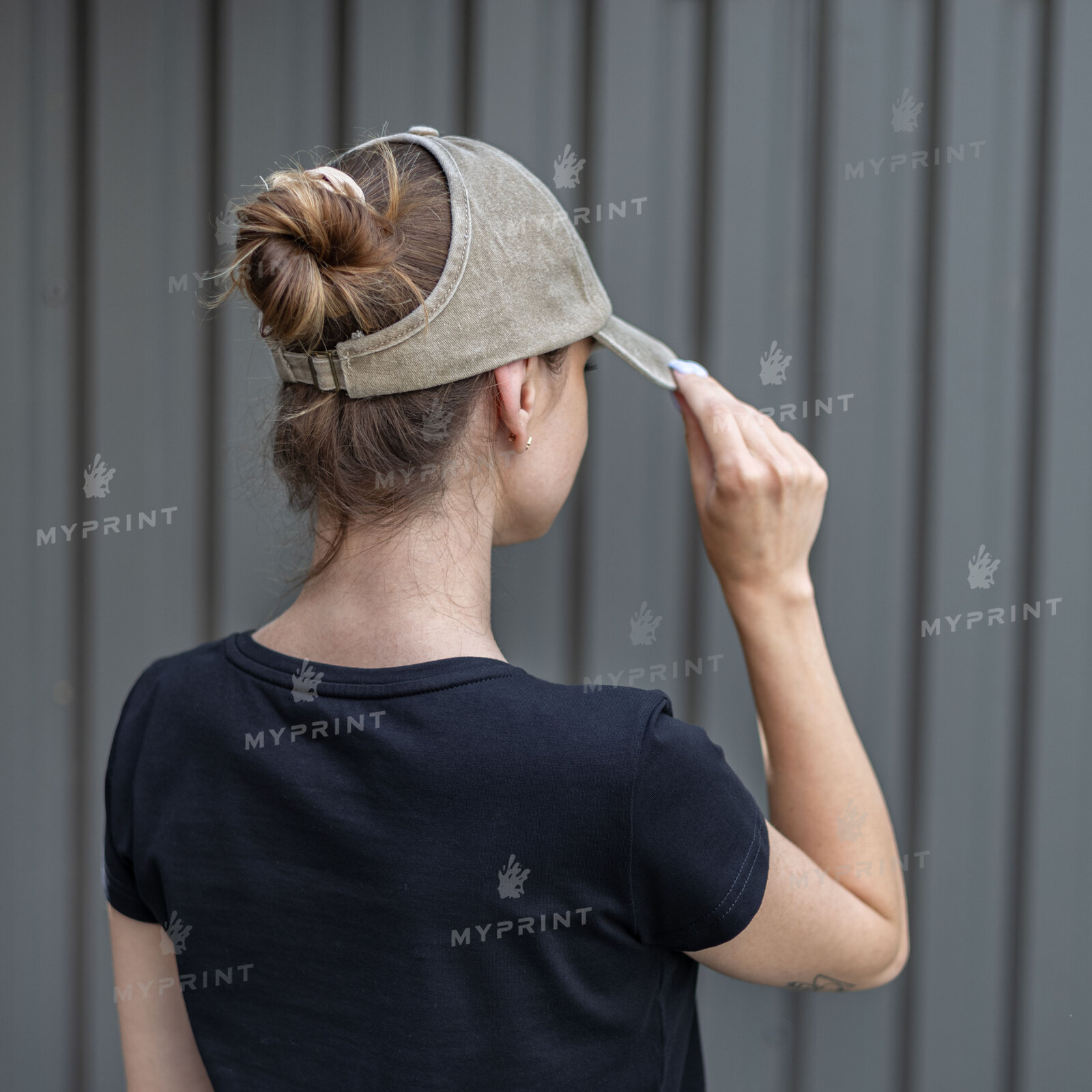 The process is complete. Six-blade cap cotton Vintage with hair opening shabby beige is now not just a blank, but a finished product with a unique image or photo.