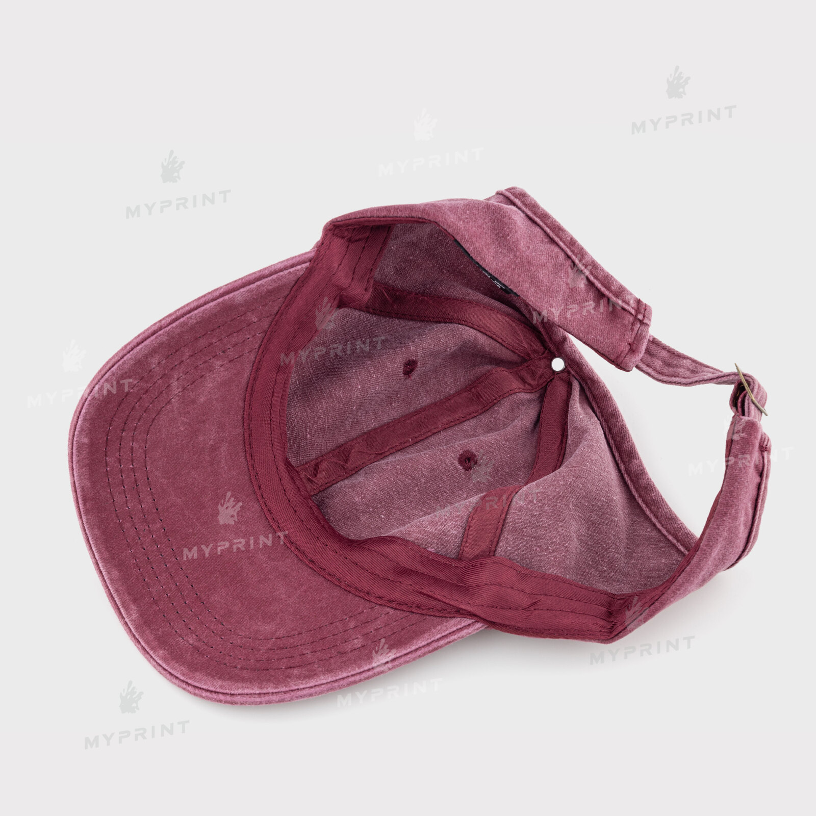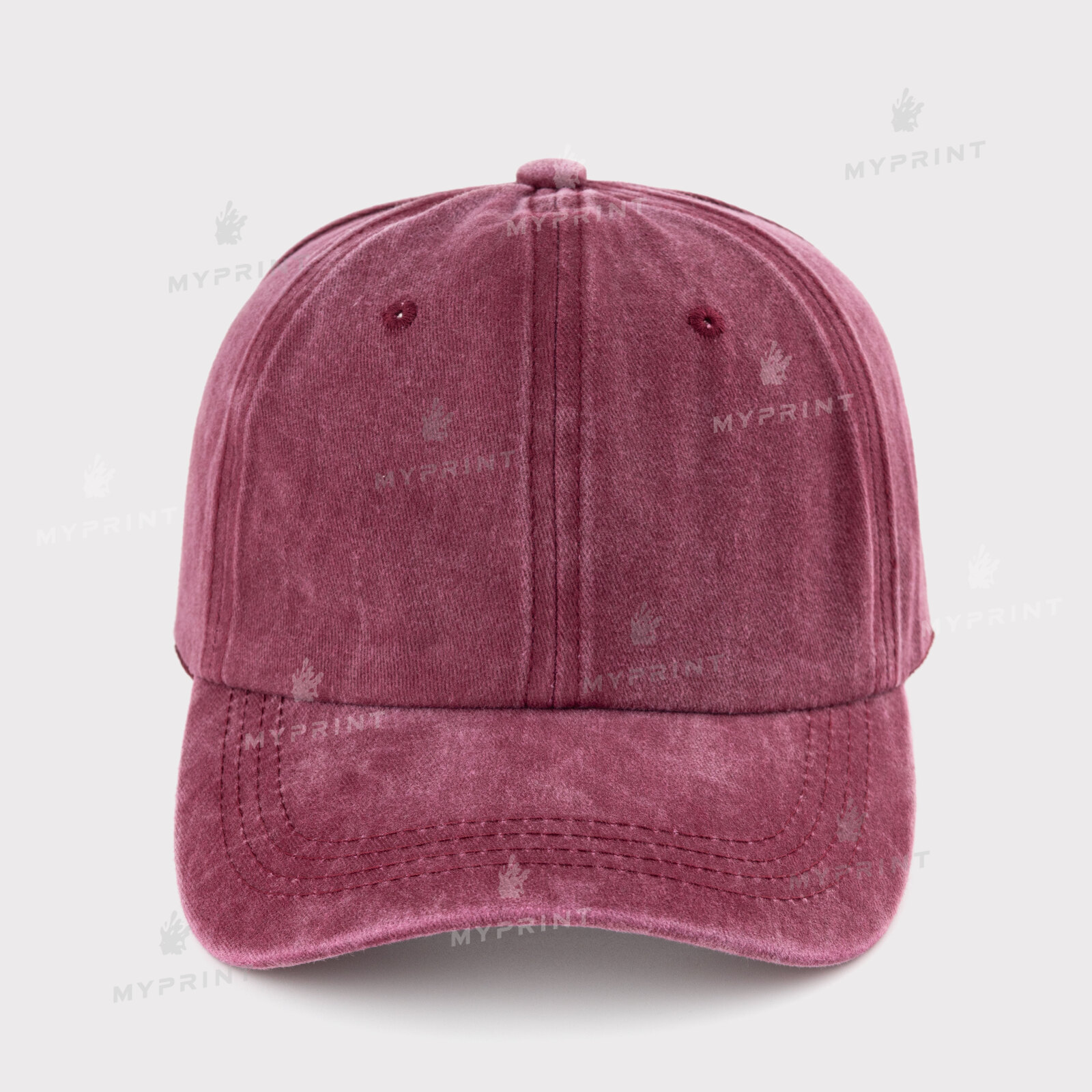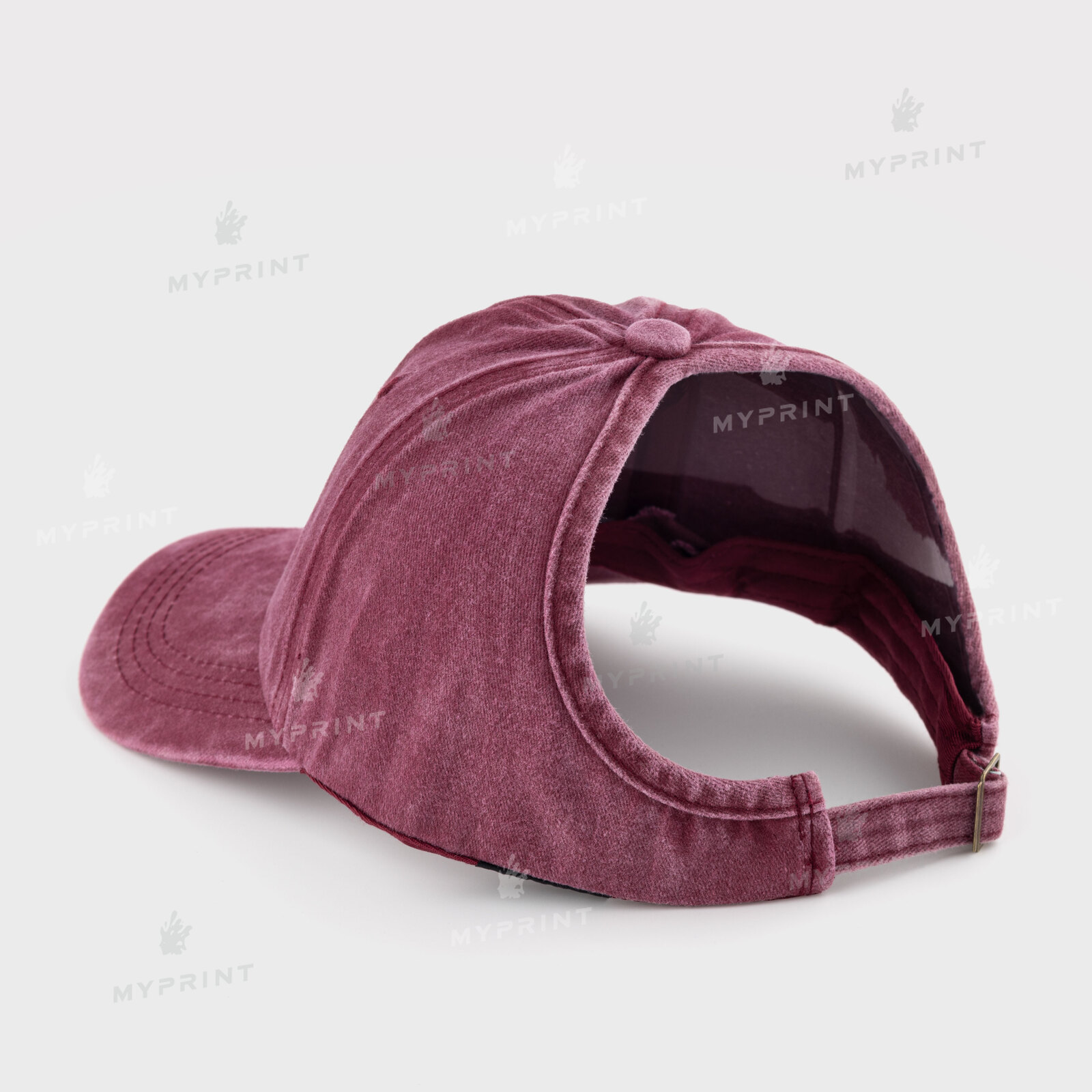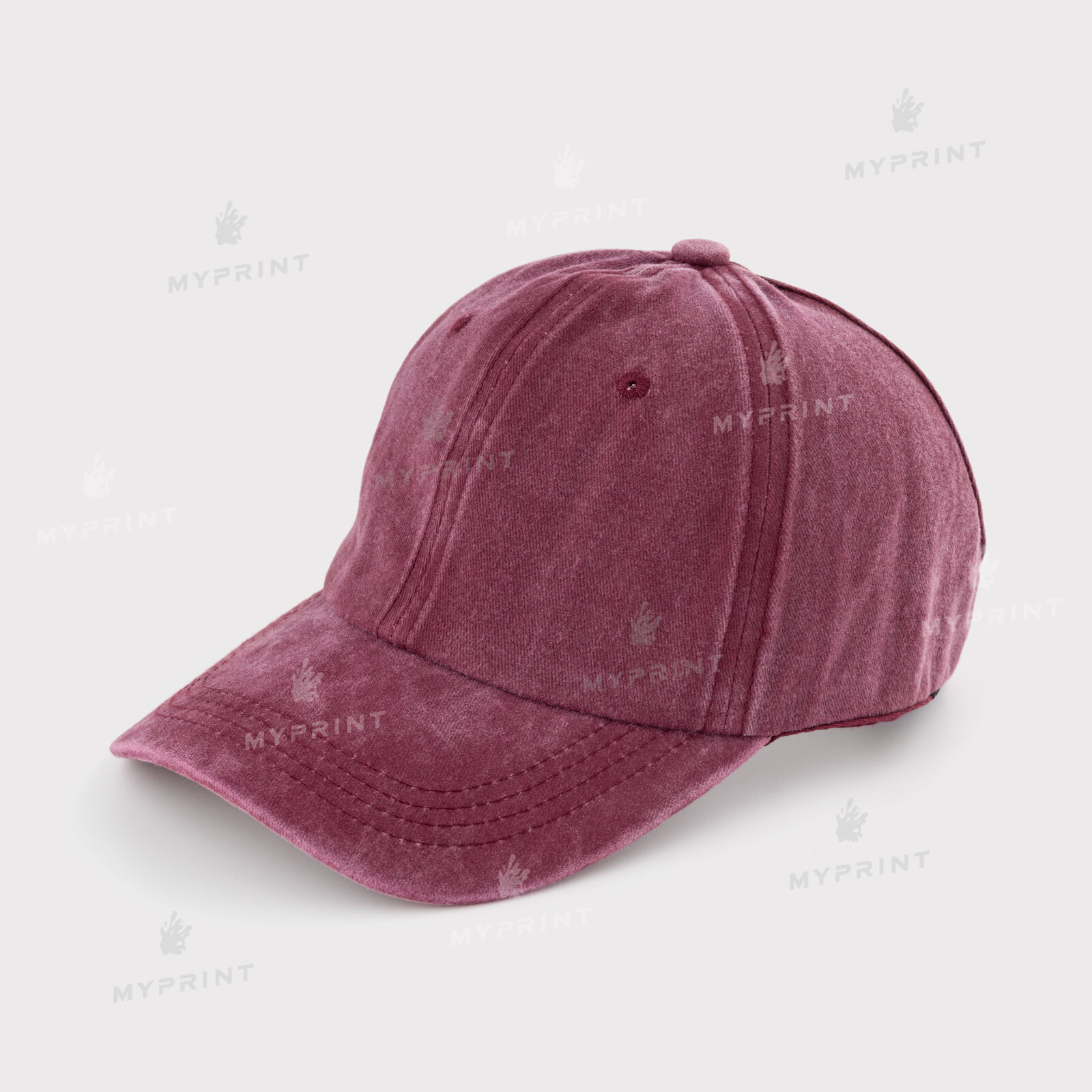 You can apply the image on Six-blade cap cotton Vintage with hair opening shabby maroon using the DTF printing method and thermal transfer.