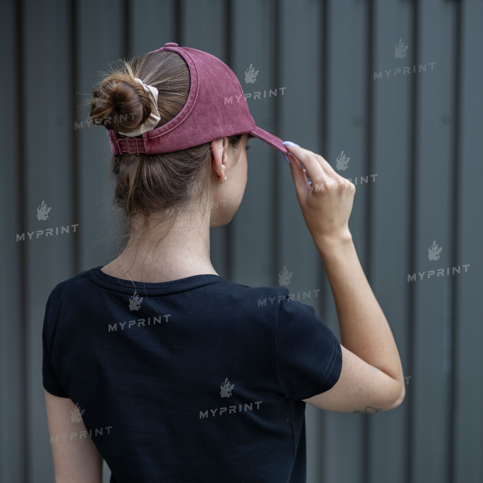 The process is complete. Six-blade cap cotton Vintage with hair opening shabby maroon is now not just a blank, but a finished product with a unique image or photo.
