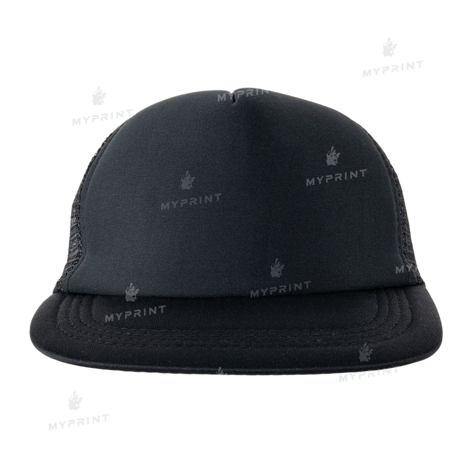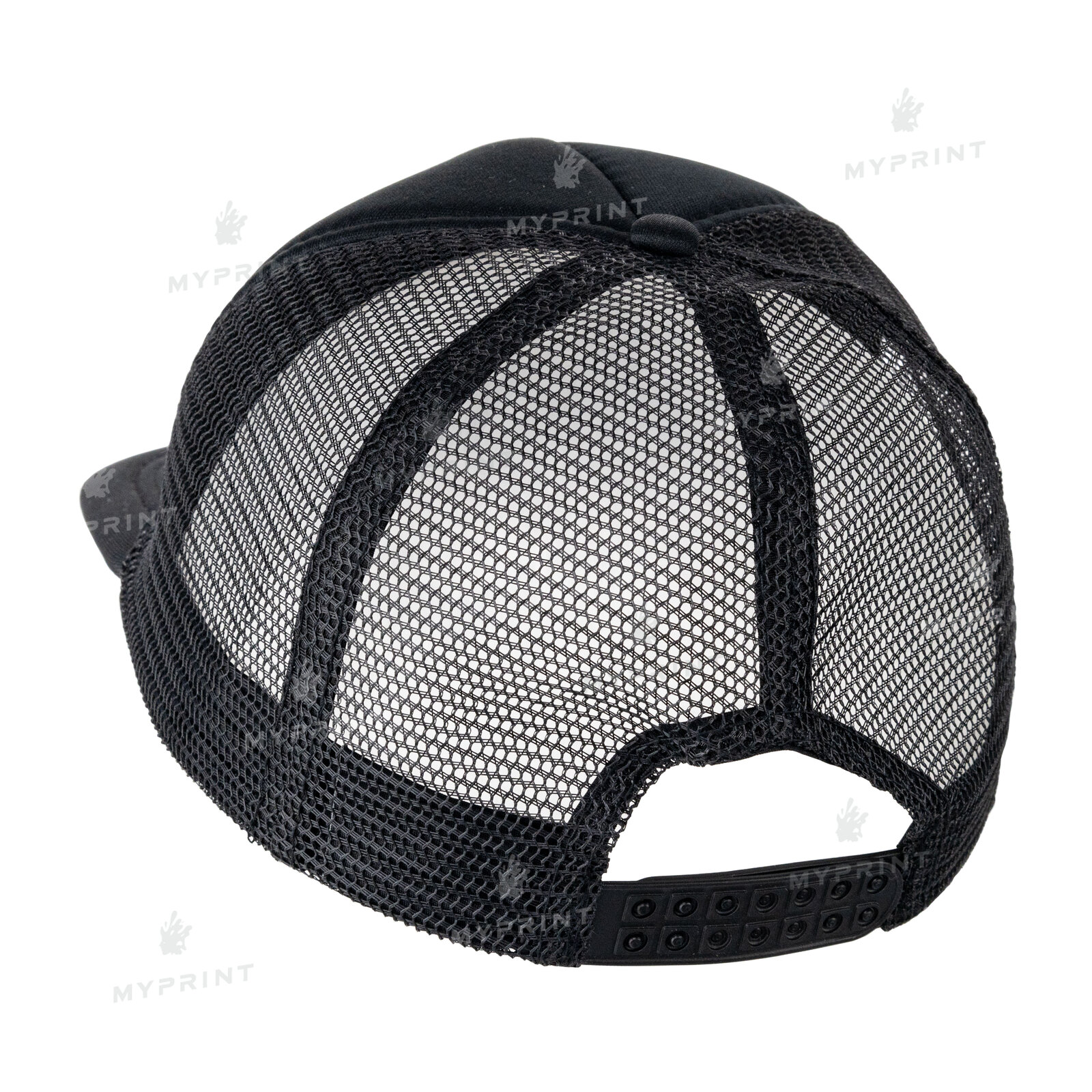 The process is complete. Cap trucker for thermal transfer with a straight visor, black is now not just a blank, but a finished product with a unique image or photo.