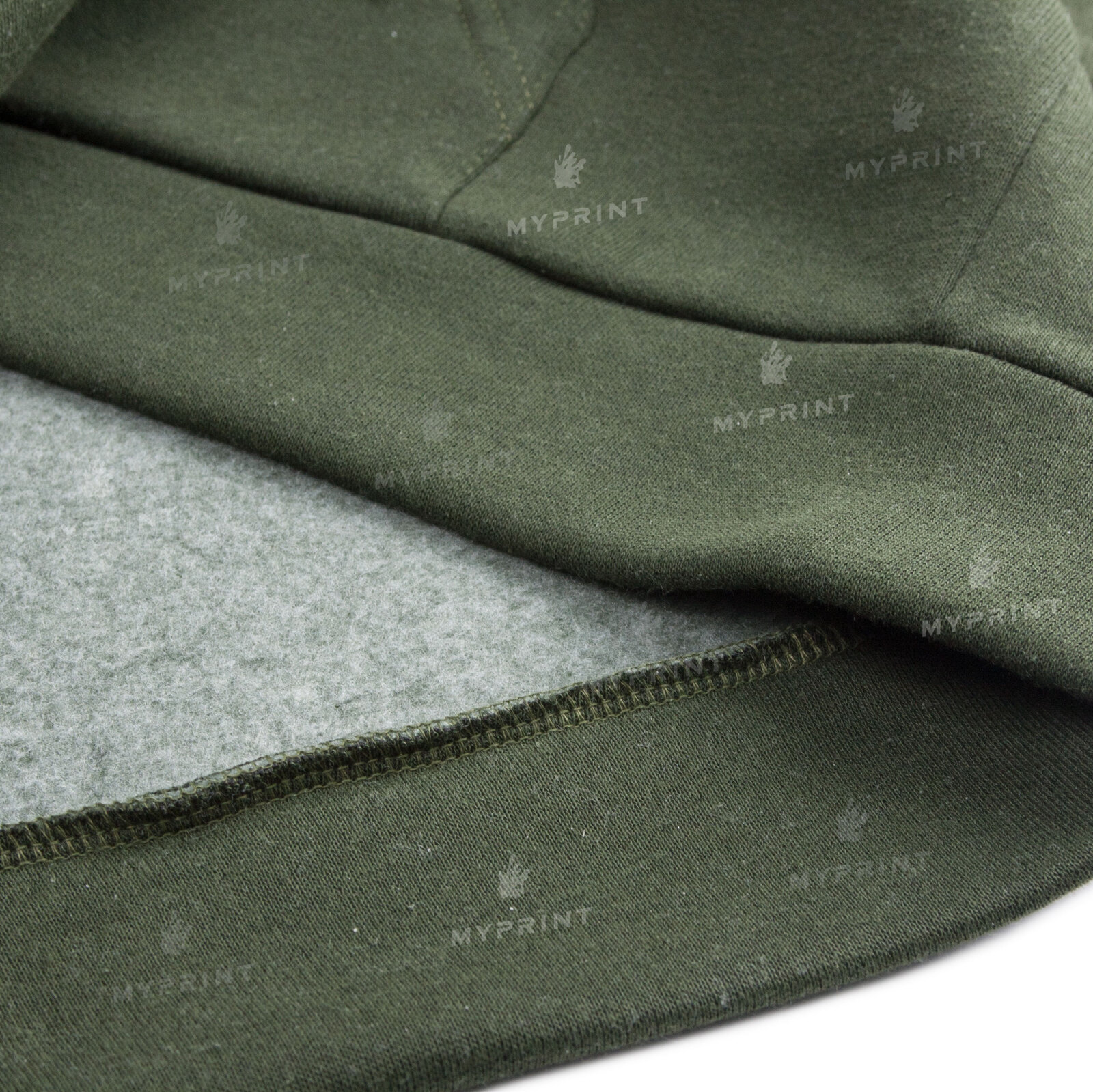 The process is complete. 300gsm Nacho Tri-Thread Unisex Pocket Print Hoodie, Olive, S is now not just a blank, but a finished product with a unique image or photo.