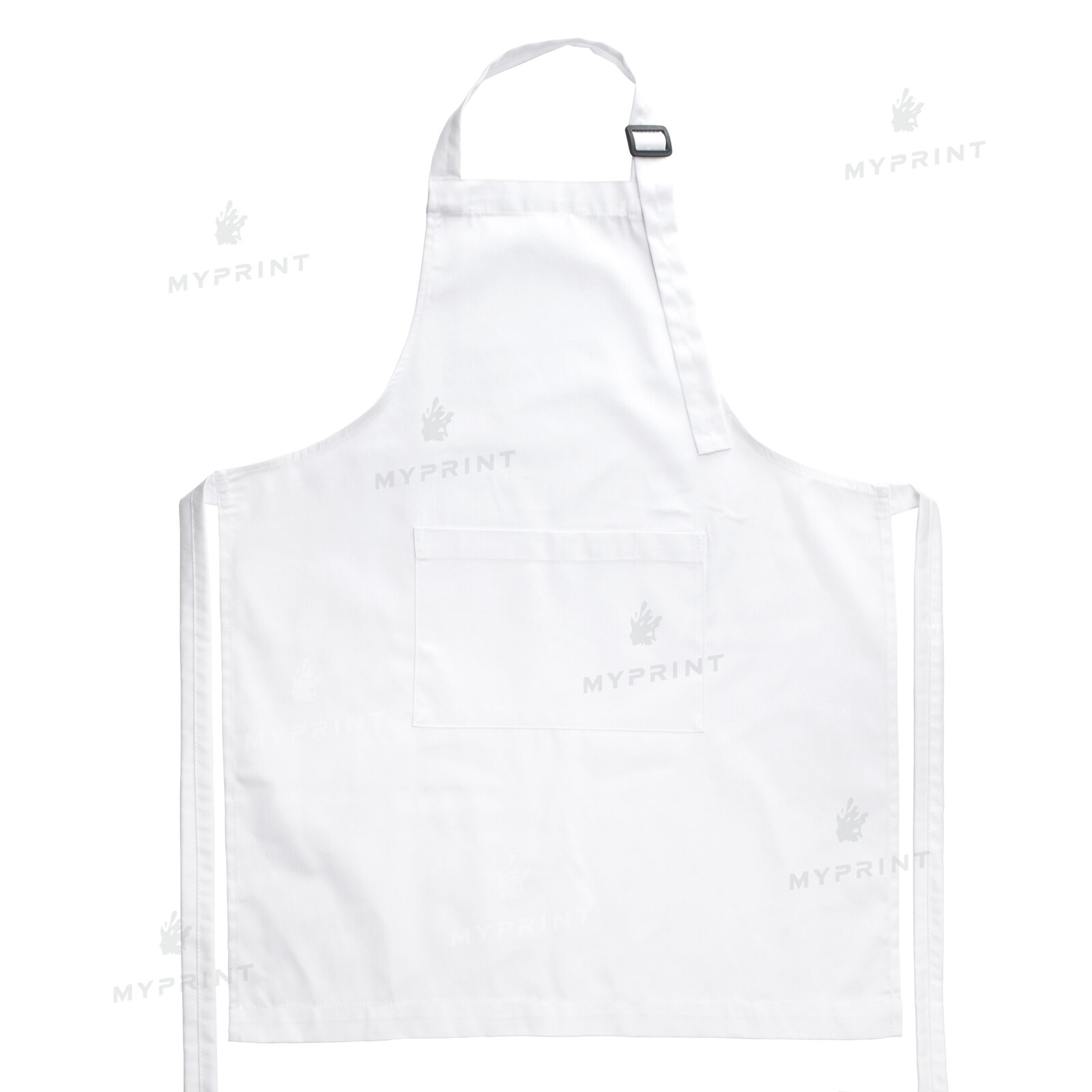 - Apron for sublimation in twill with an adjustable strap and an elongated pocket in white.