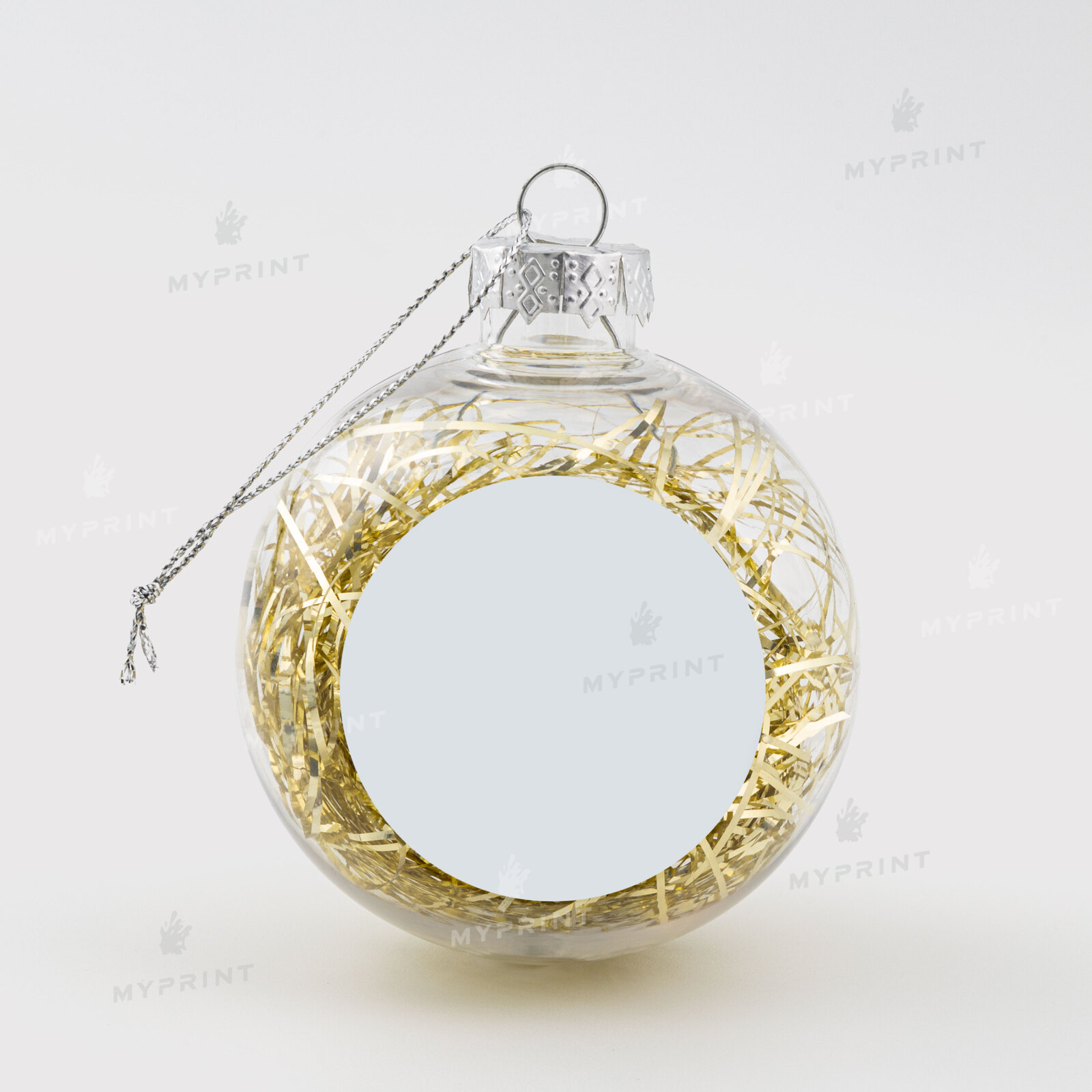 Description Christmas tree ornament for sublimation in the shape of a ball with tinsel, gold, 8 cm (11137)