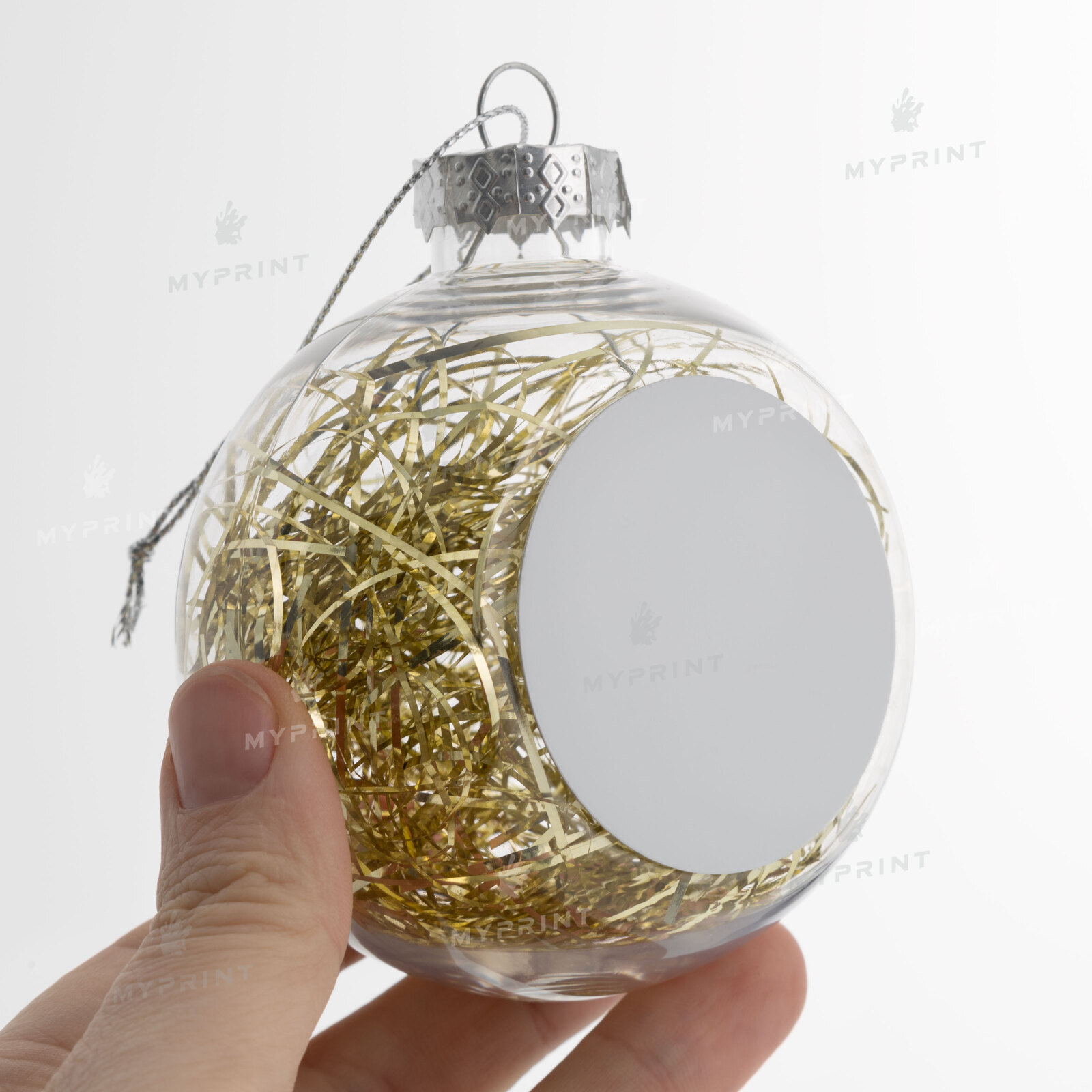 The process is complete. New Year's ball with rain for sublimation golden 8 cm is now not just a blank, but a finished product with a unique image or photo.