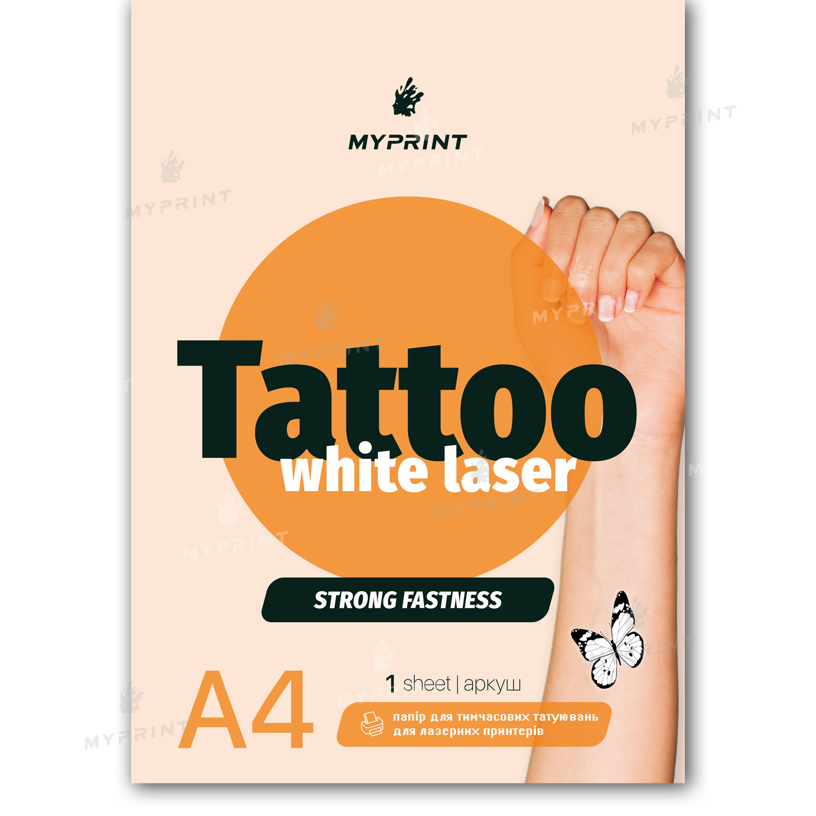 Бумага для временных татуировок My Print Tattoo Laser White Strong fastness сильной фиксации для лазерного принтера А4, 1 лист (10139)