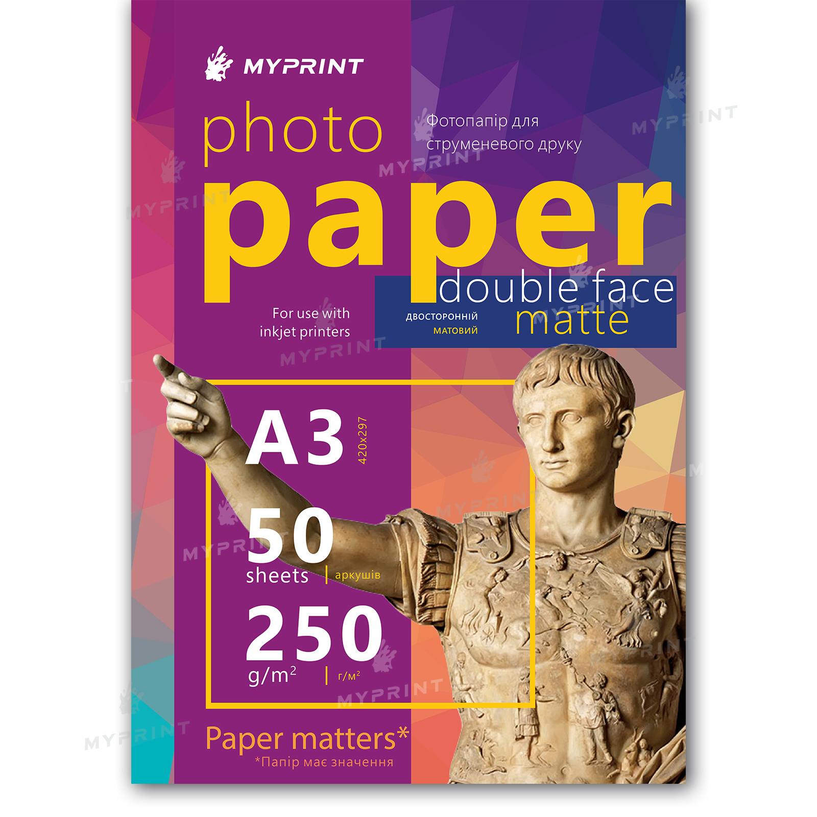 Фотобумага My Print матовая двусторонняя 250 г/м², A3, 50 листов - это качественная бумага разработанная специально для фотопечати на всех типах струйных принтеров: Epson, Canon, HP и других.