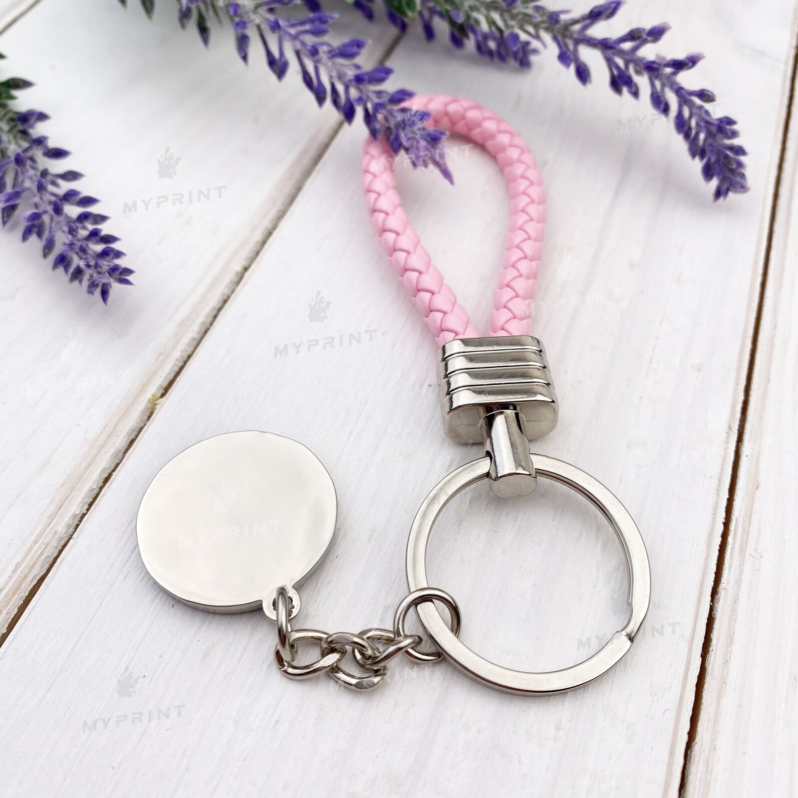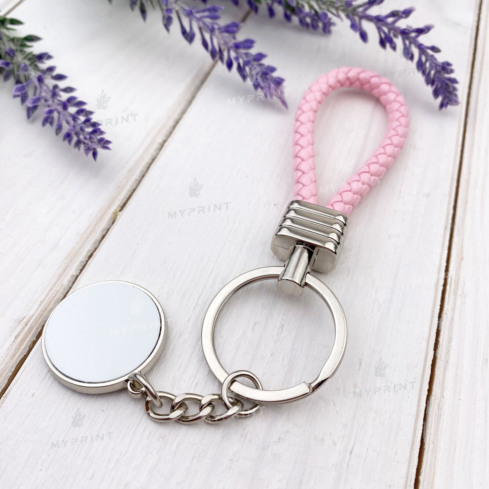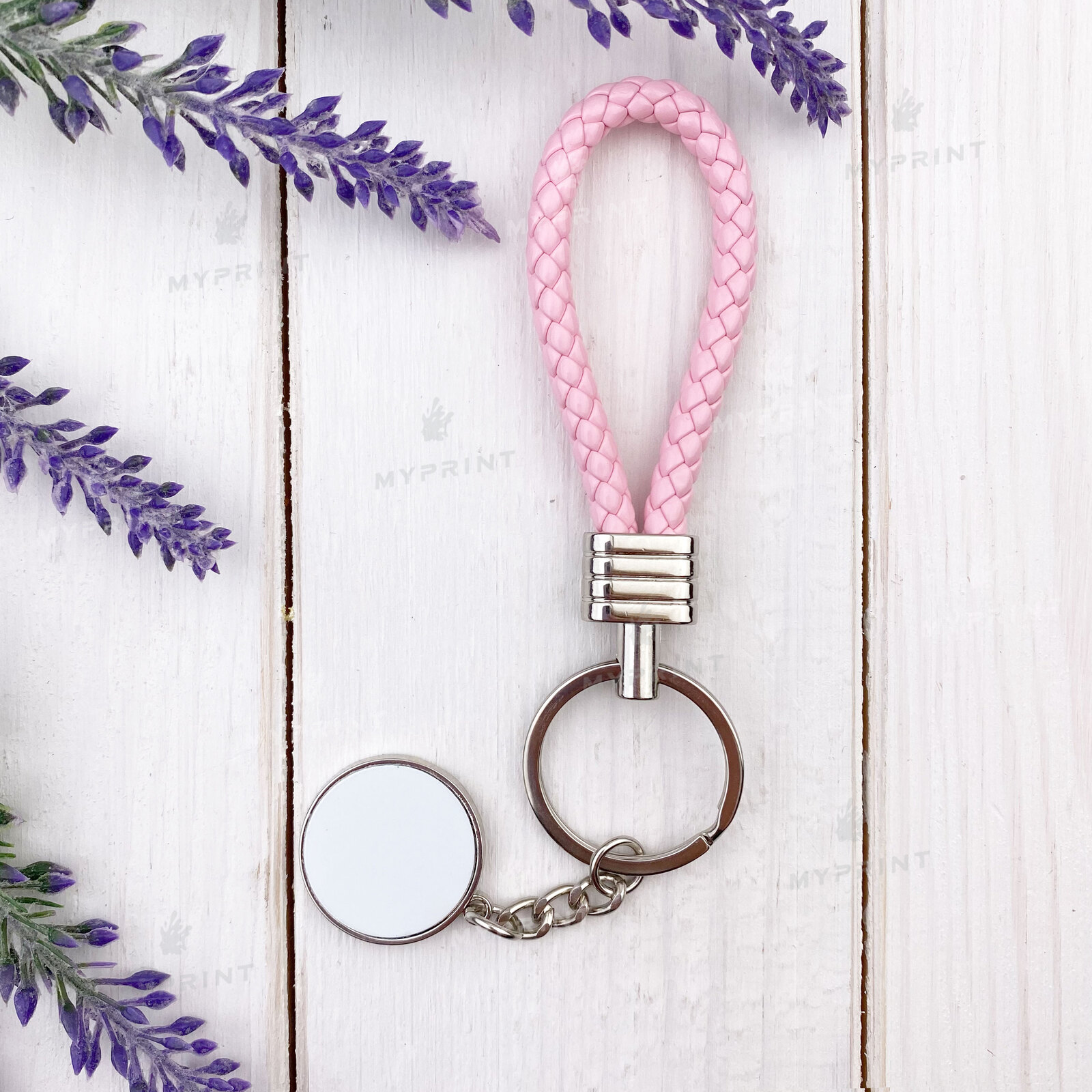 - Брелок для сублимации односторонний круглый с розовым кожаным плетеным шнурком d = 25 мм