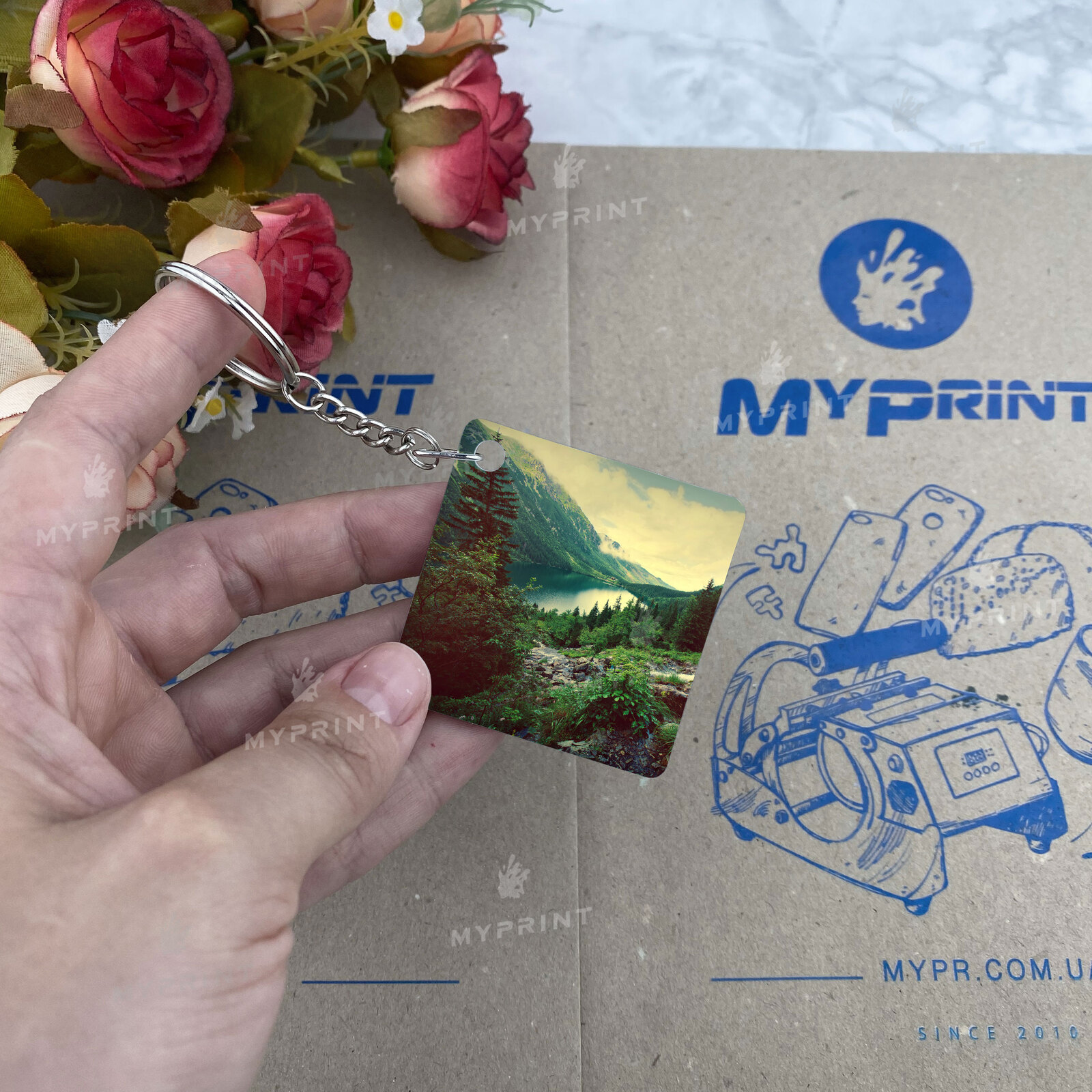 Процесс завершен. Брелок для сублимации пластиковый двусторонний квадратный 50*50 мм теперь не просто заготовка, а готовое изделие с уникальным изображением или фотографией.