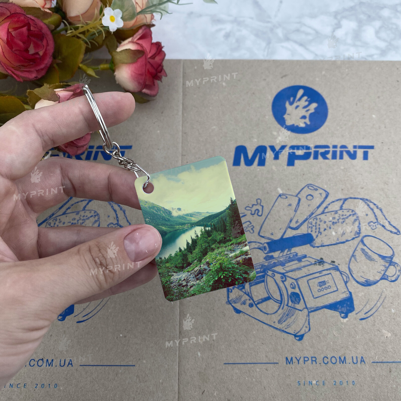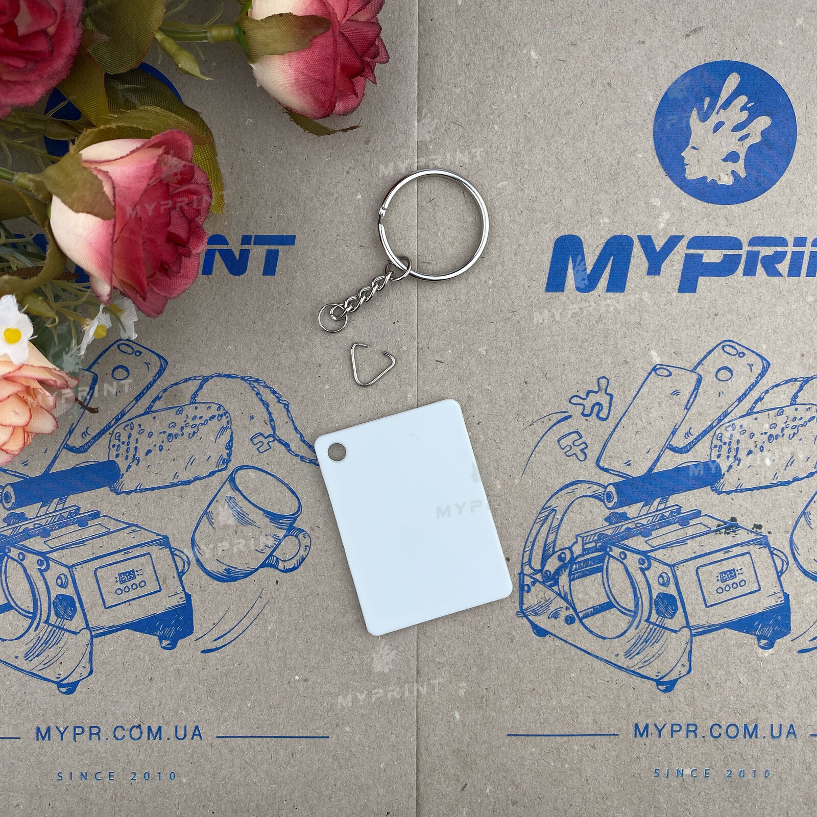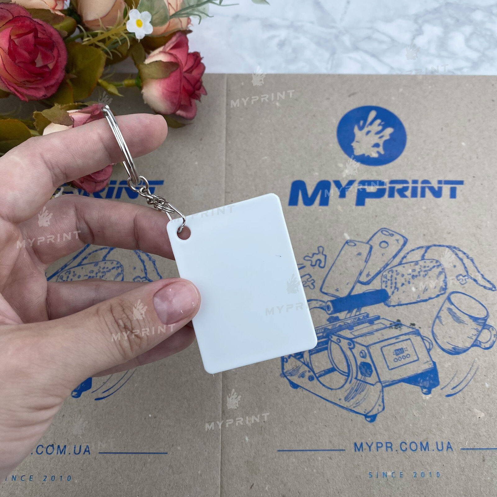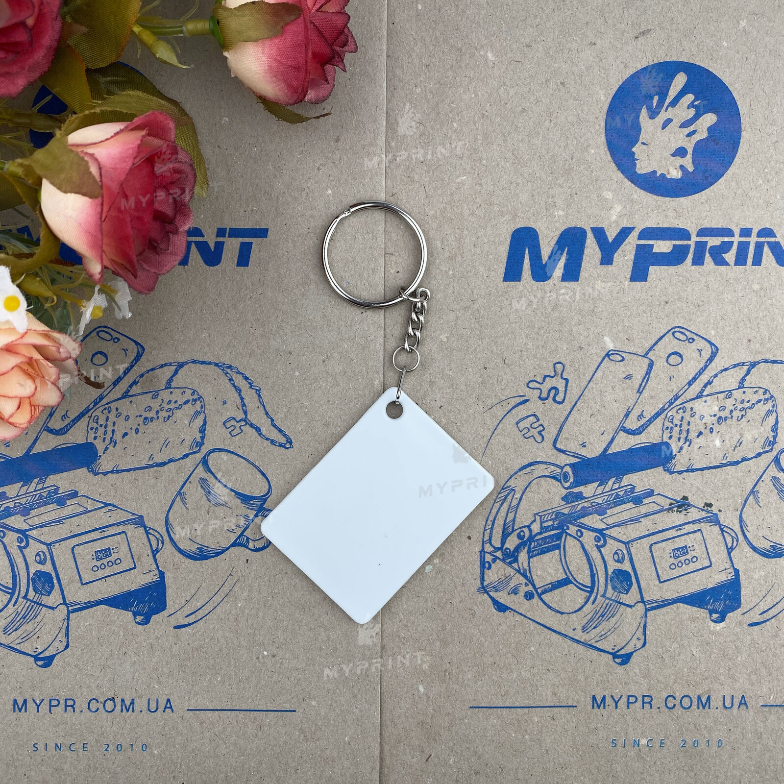 Процесс завершен. Брелок для сублимации пластиковый двусторонний прямоугольный 55*40 мм теперь не просто заготовка, а готовое изделие с уникальным изображением или фотографией.