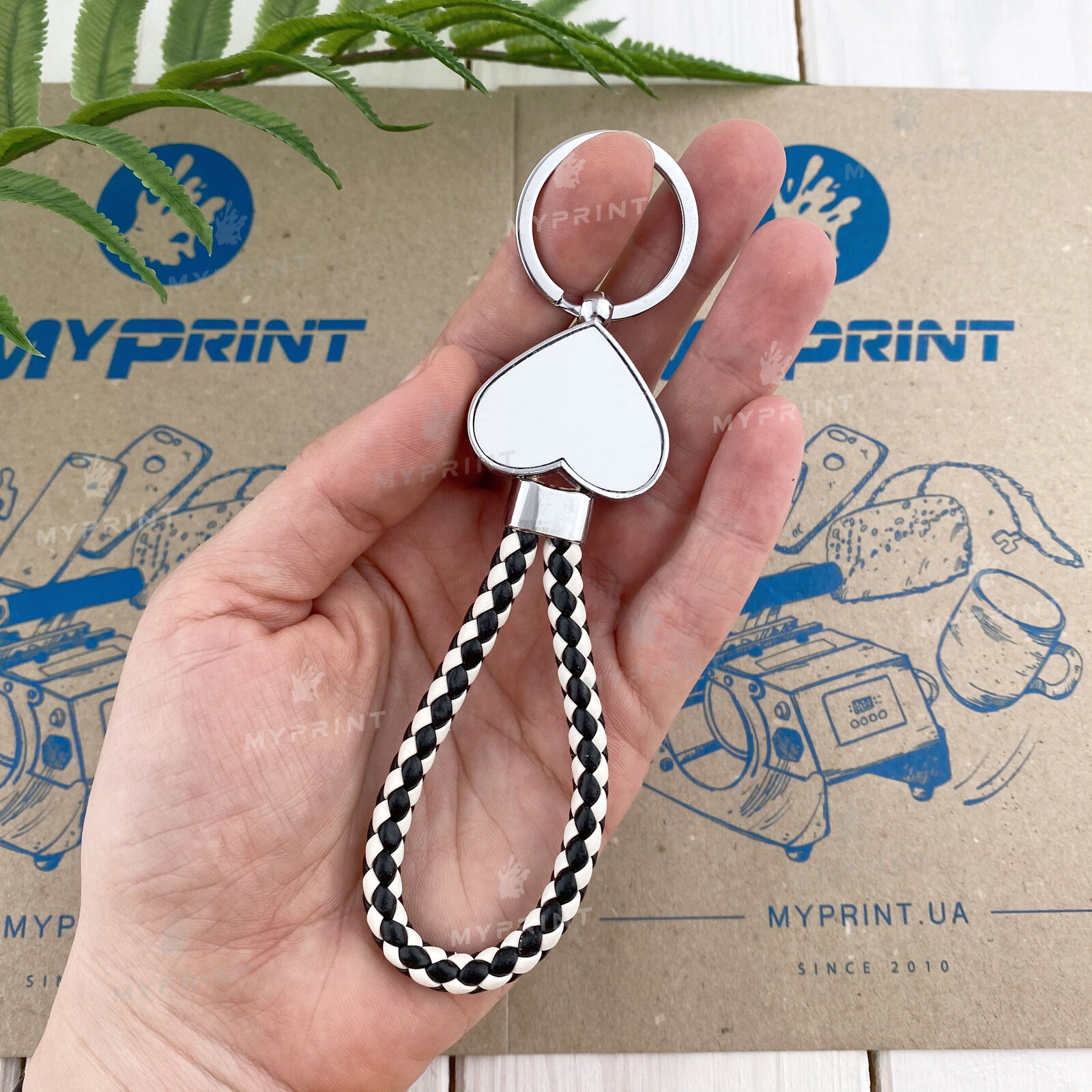 - Брелок для сублимации в форме сердца двусторонний с черным / белым кожаным плетеным шнурком 30*25 мм
