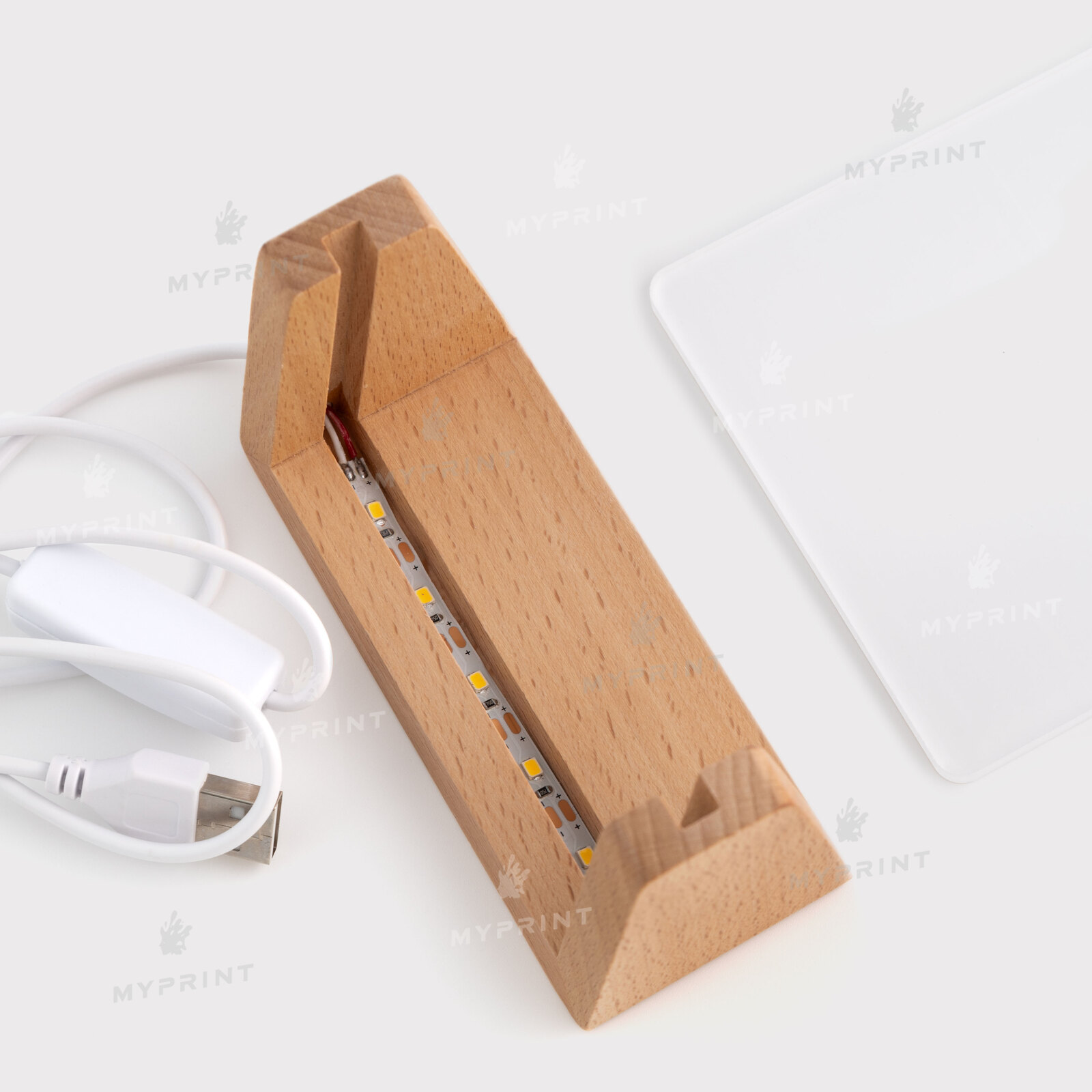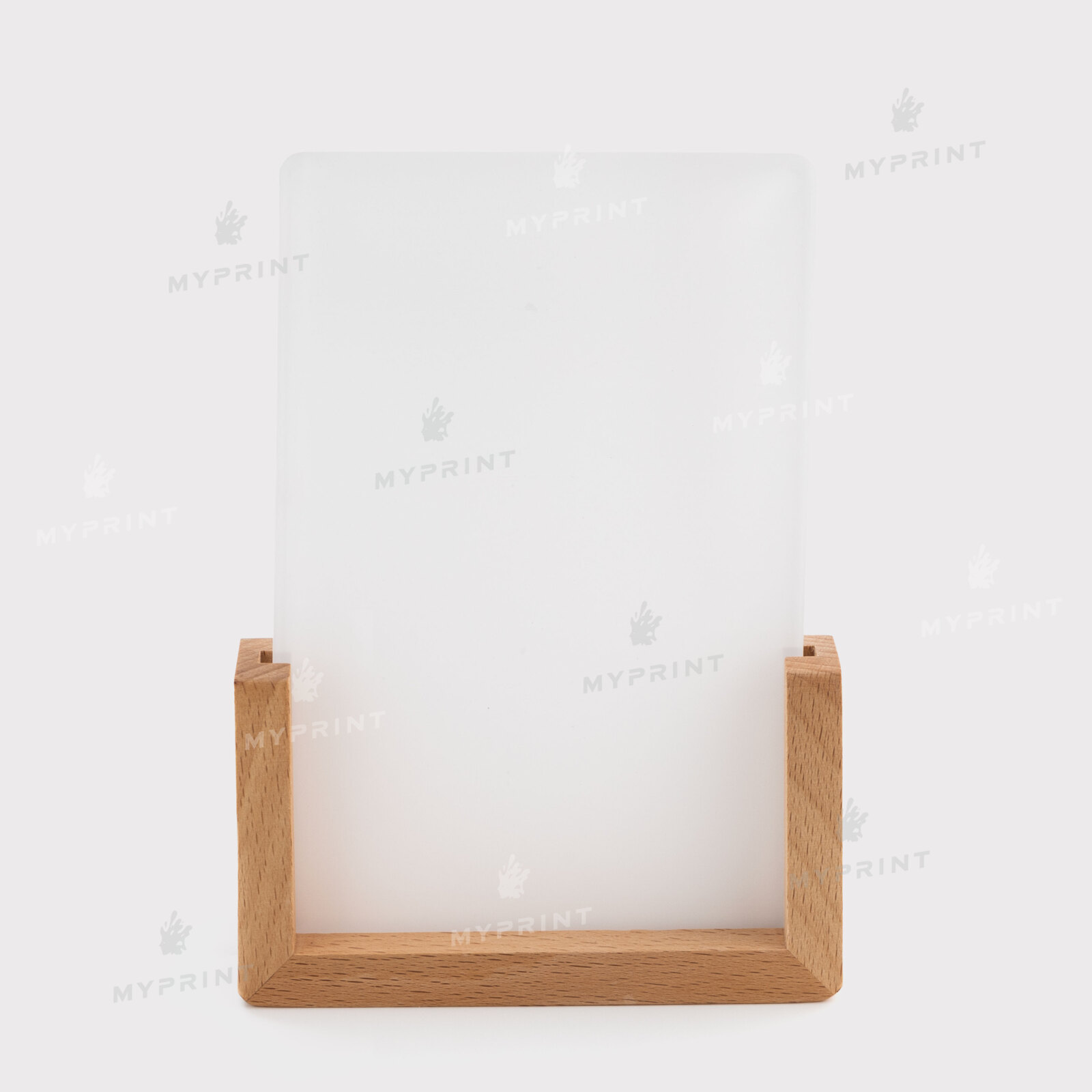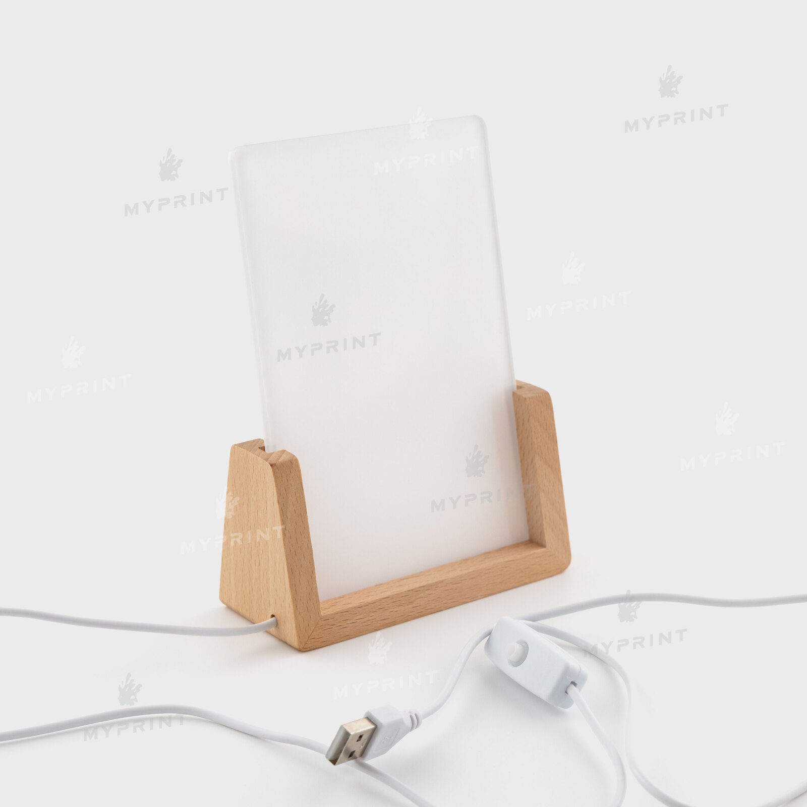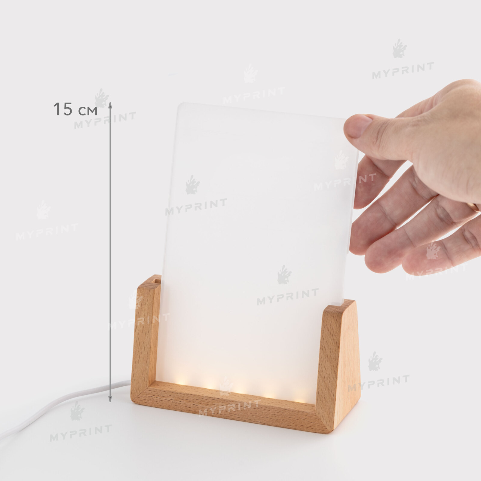 - Акриловая фоторамка для сублимации с LED-подсветкой и деревянной подставкой прямоугольная