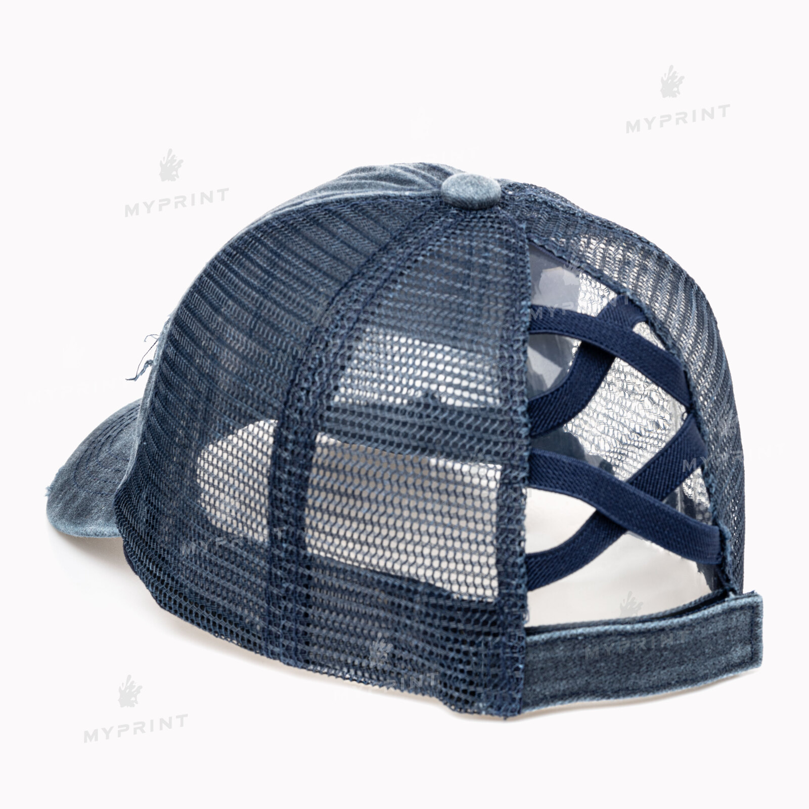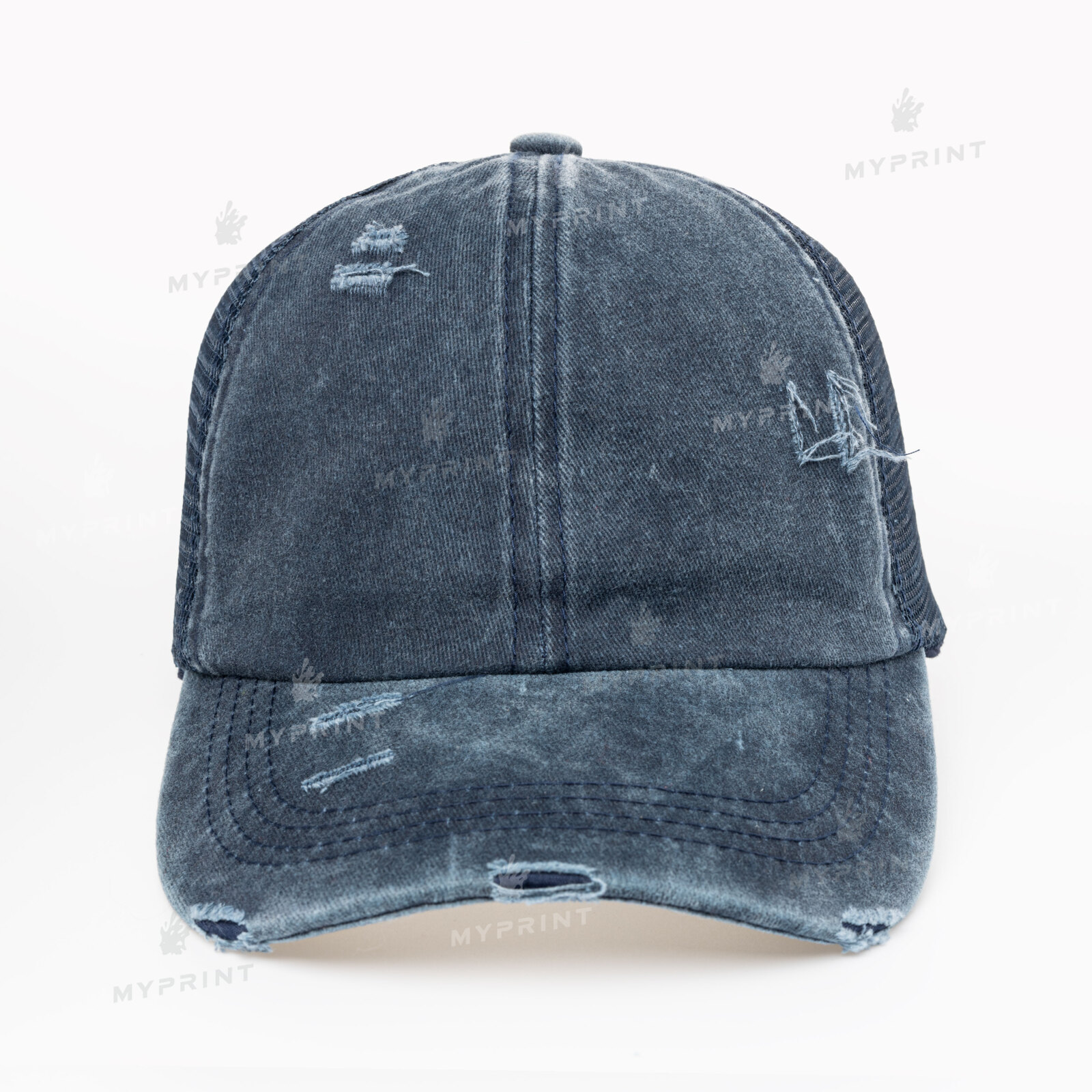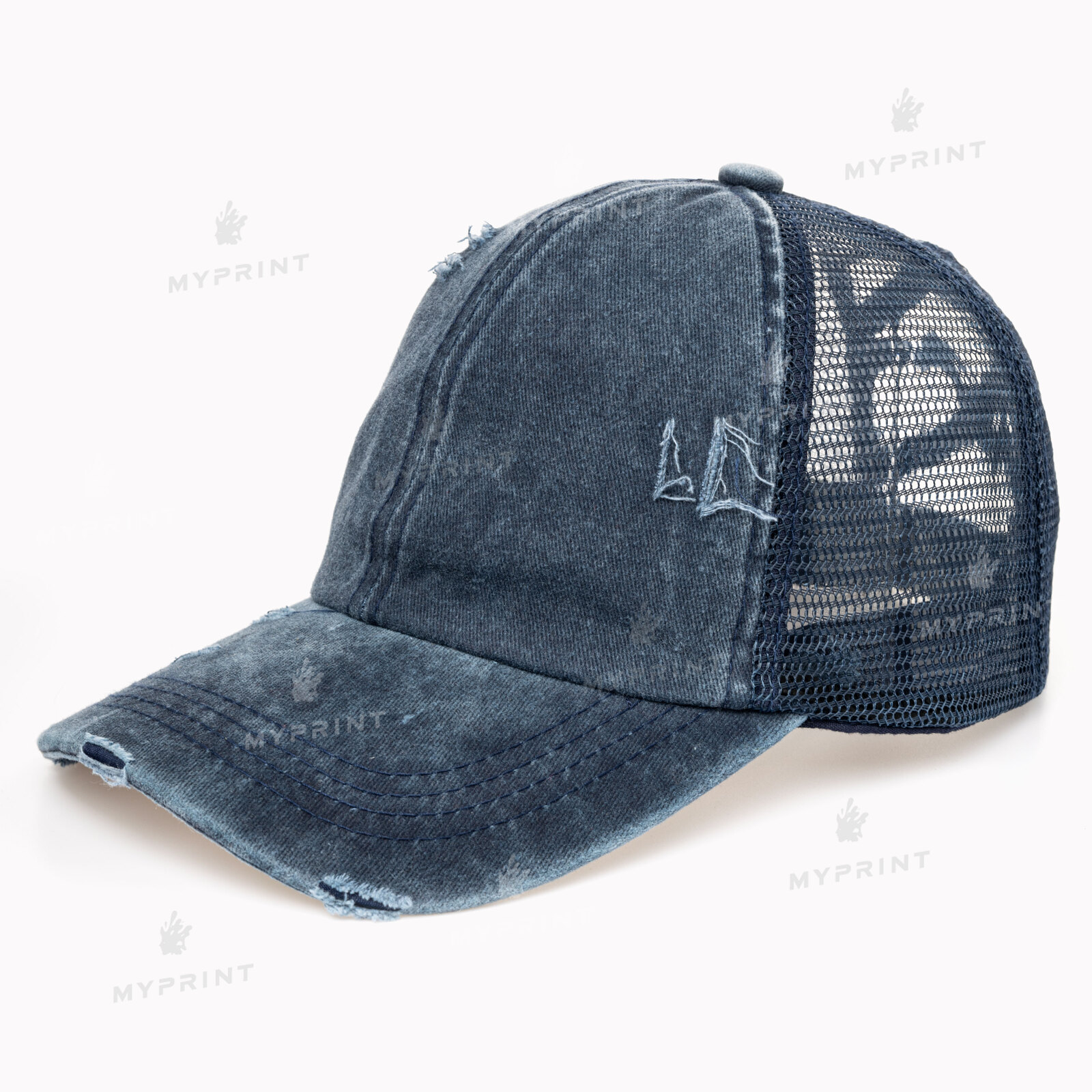 Нанести изображение на Кепка шестиклинка для термопереноса хлопок Vintage с сеткой и резинкой потертая темно-синяя можно методом DTF печати и термотрансфера.