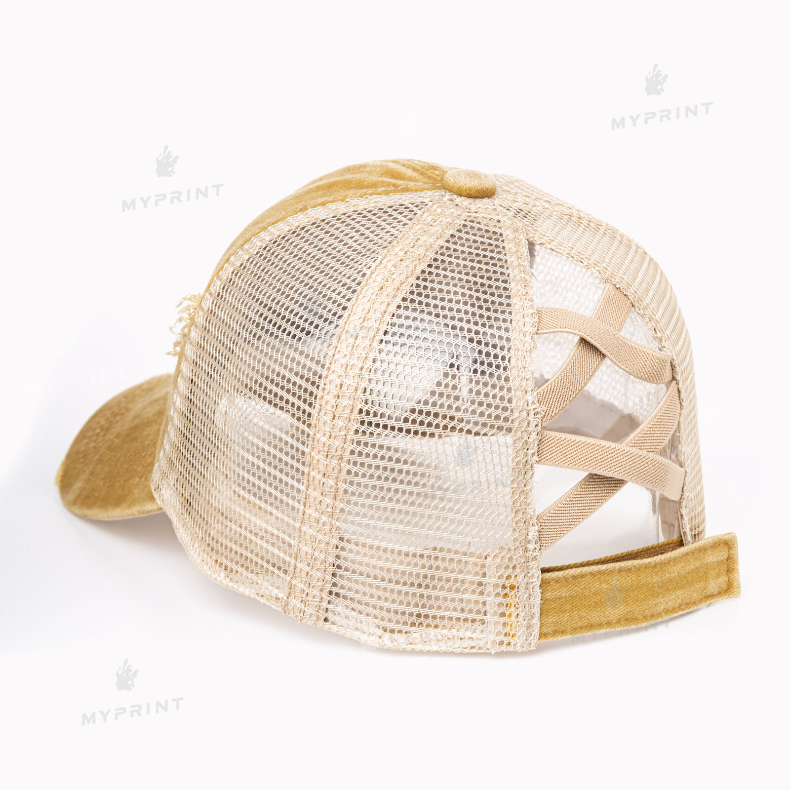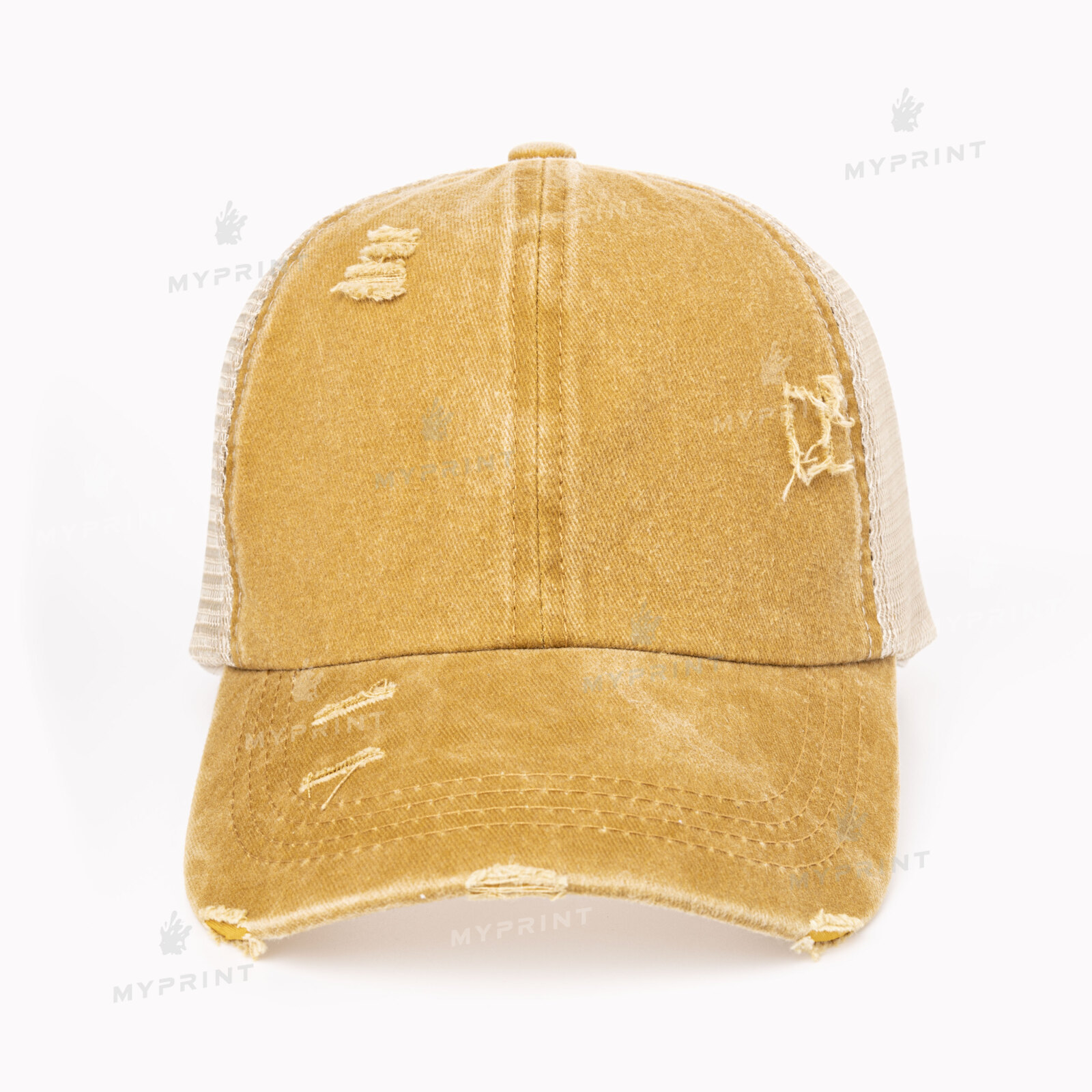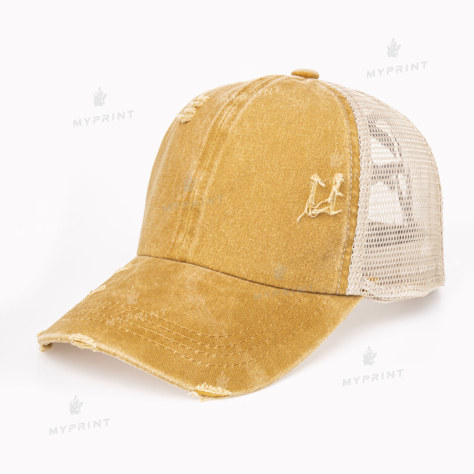 Нанести изображение на Кепка шестиклинка для термопереноса хлопок Vintage с сеткой и резинкой потертая желтая можно методом DTF печати и термотрансфера.