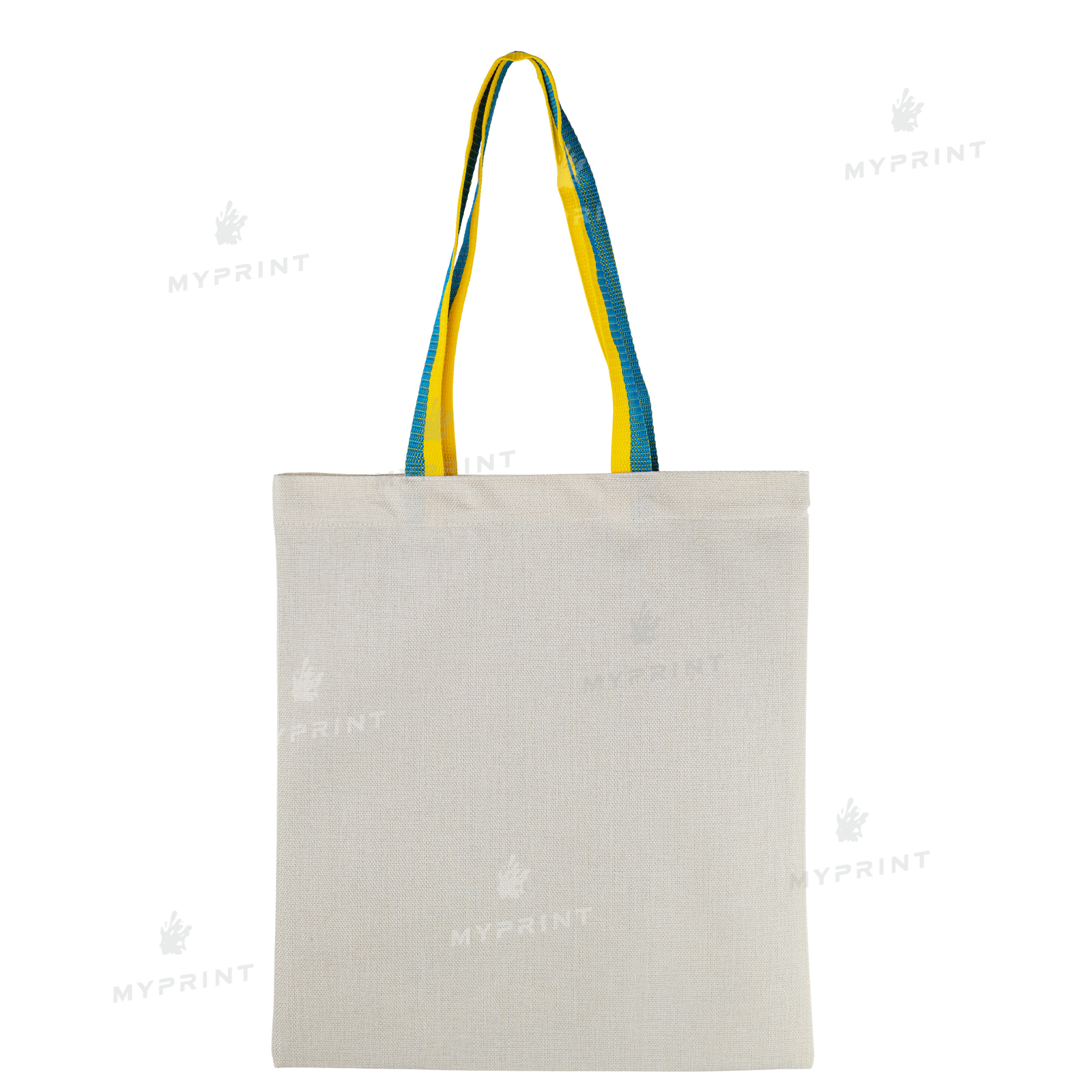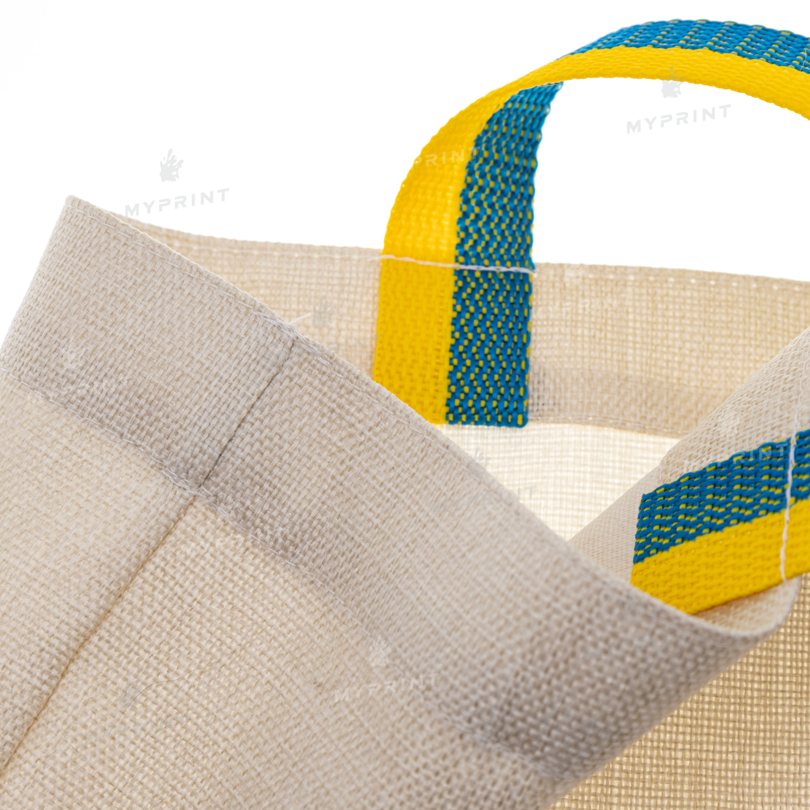 Описание Шоппер для сублимации льняной вертикальный с желто-голубыми ручками 35*38,5 см (9969)