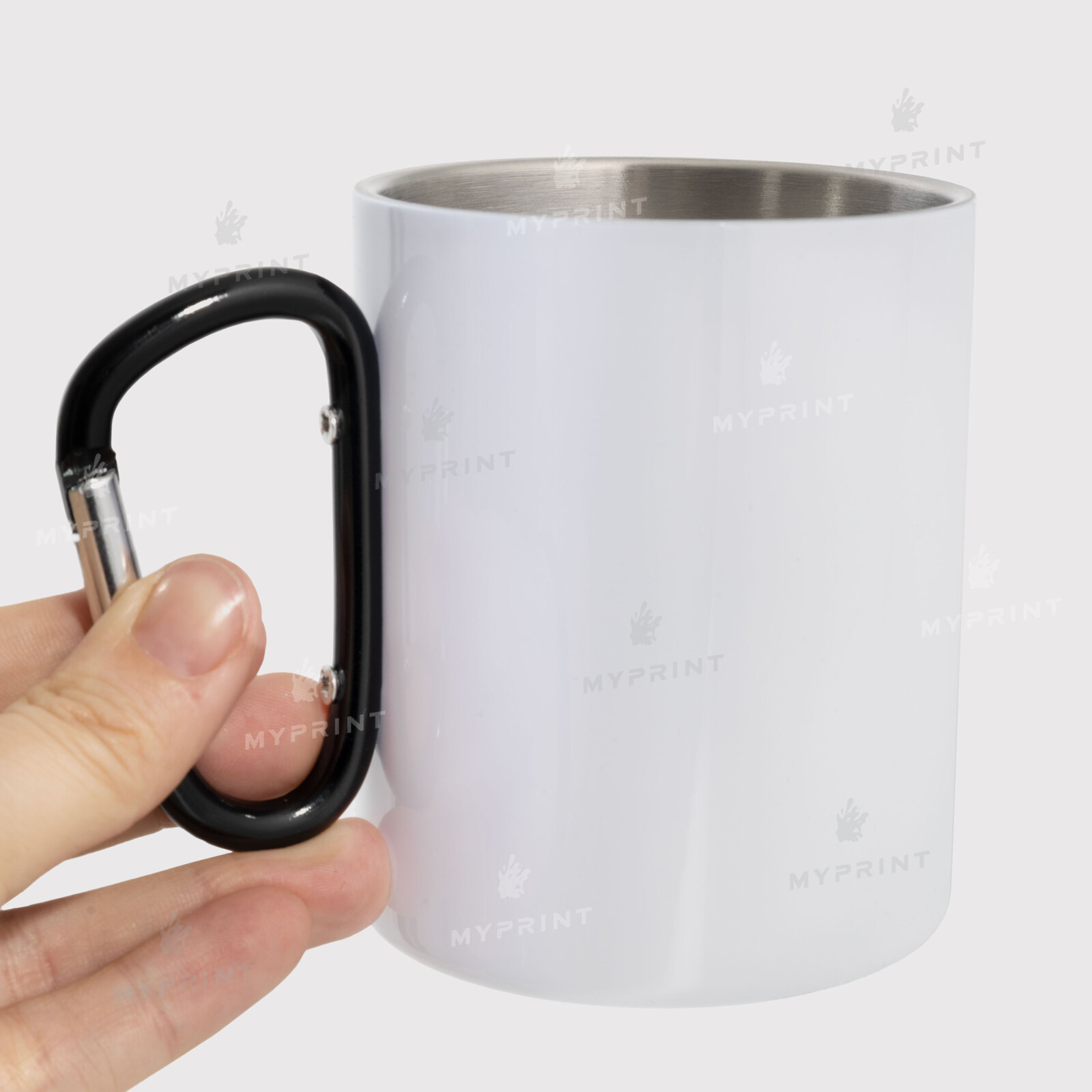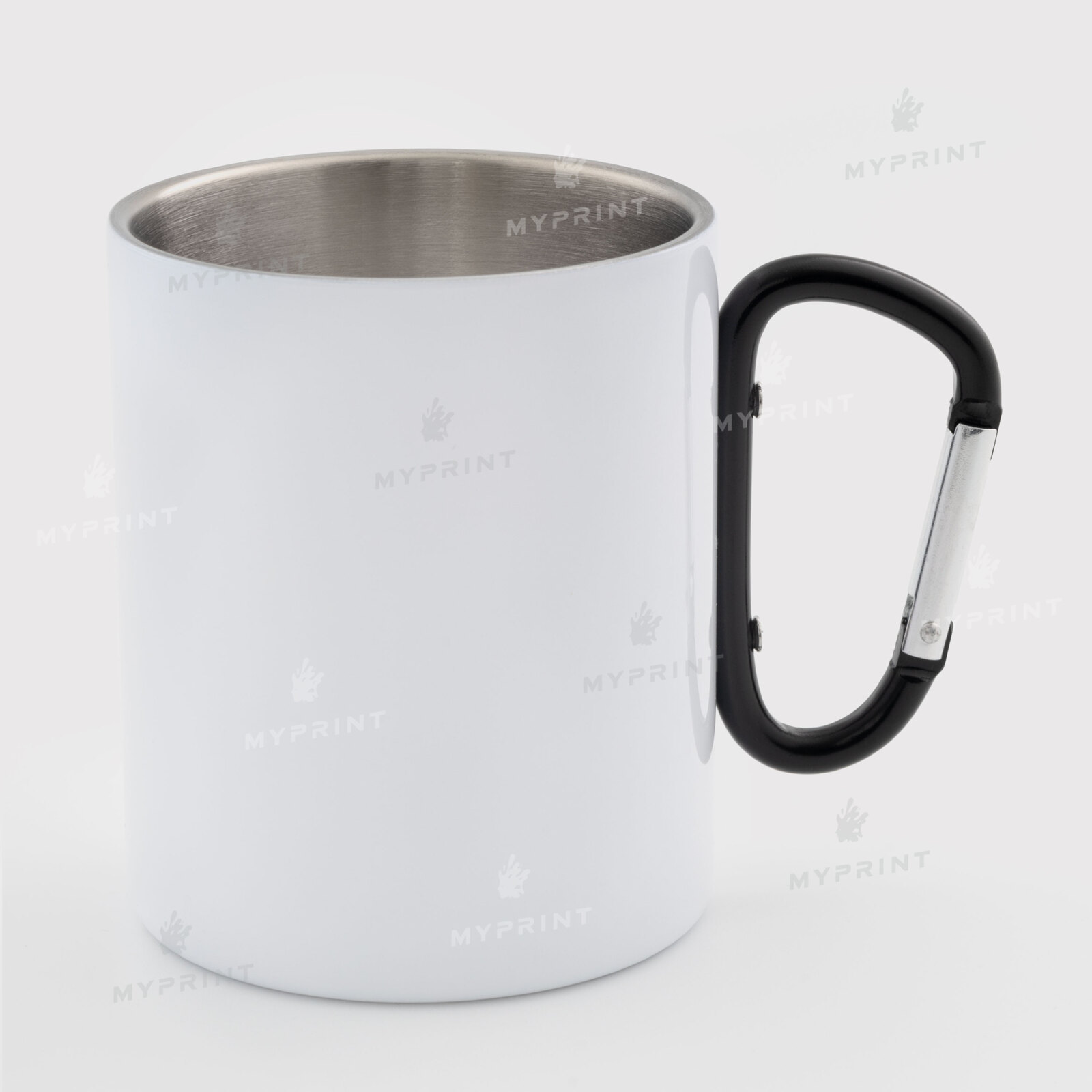 - Кружка для сублимации металлическая белая с черным карабином (400 мл)