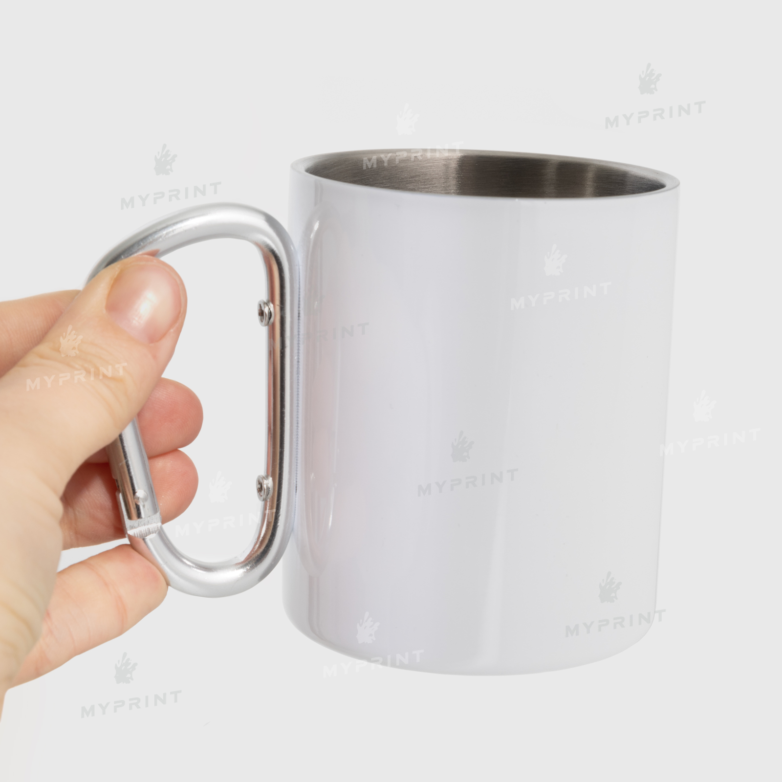 - Кружка для сублимации металлическая белая с серебристым карабином (300 мл)