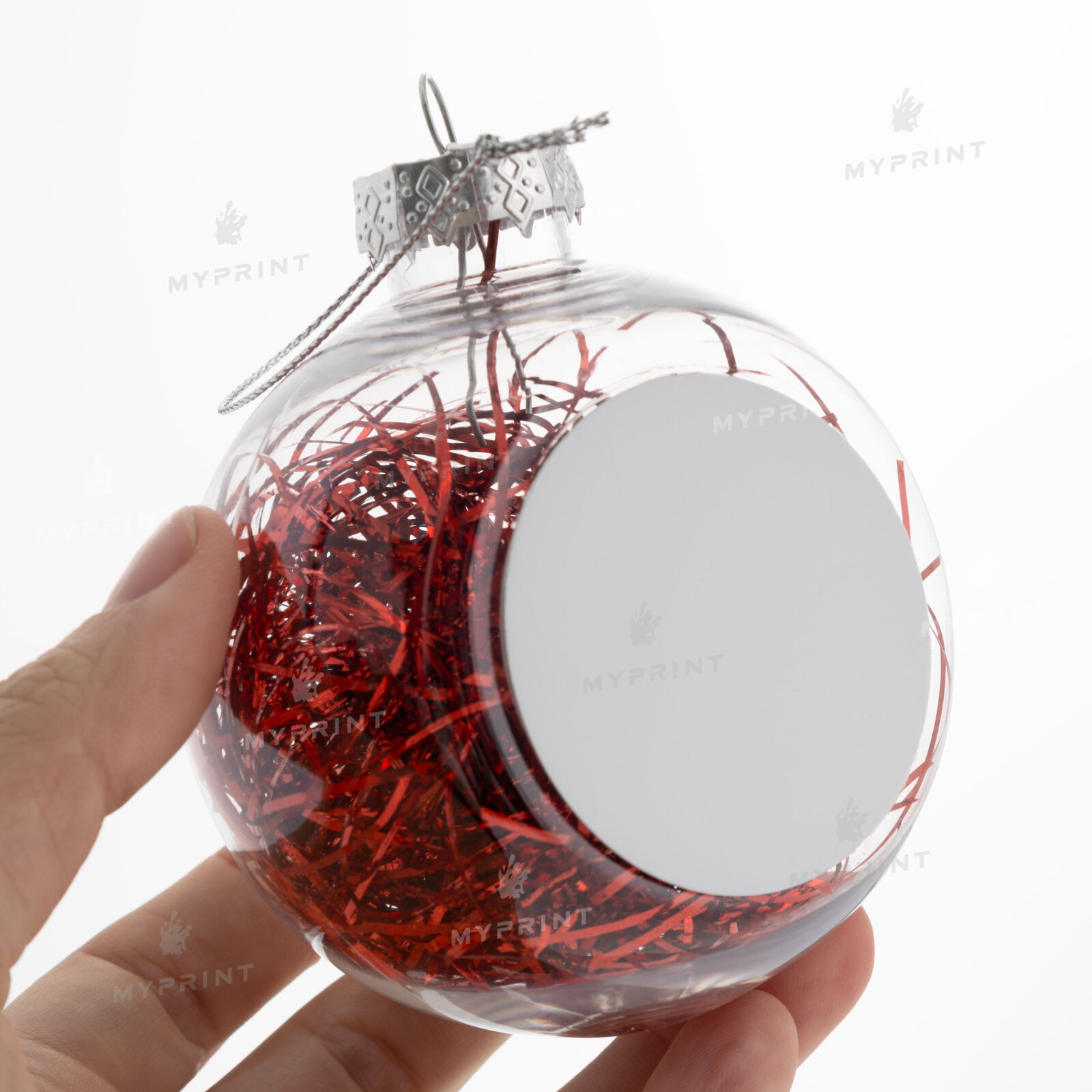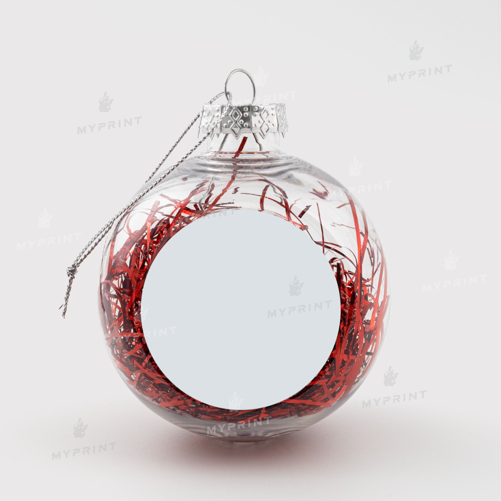 - Елочная игрушка для сублимации в форме шара с дождиком красная 8 см
