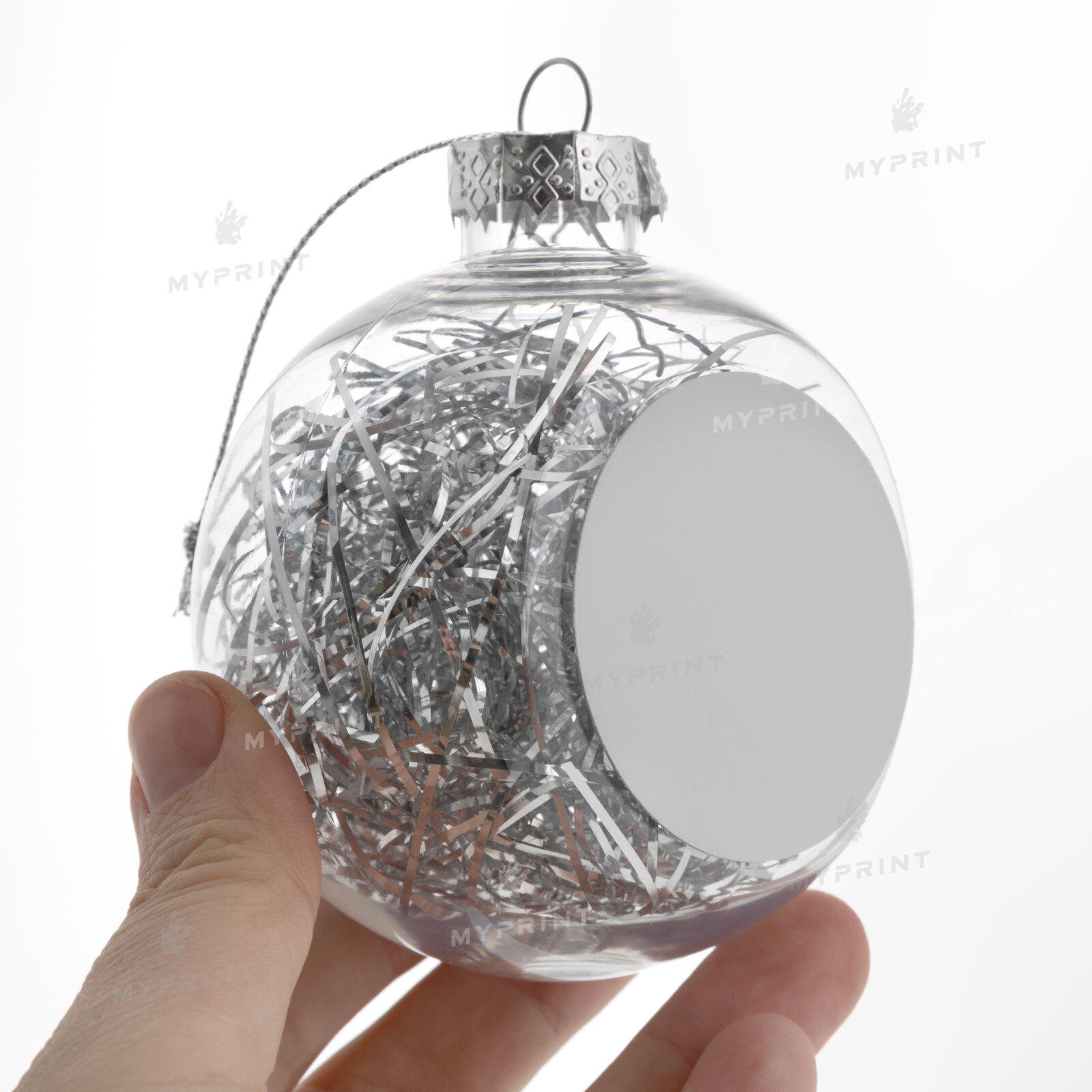 Процесс завершен. Елочная игрушка для сублимации в форме шара с дождиком серебристая 8 см теперь не просто заготовка, а готовое изделие с уникальным изображением или фотографией.