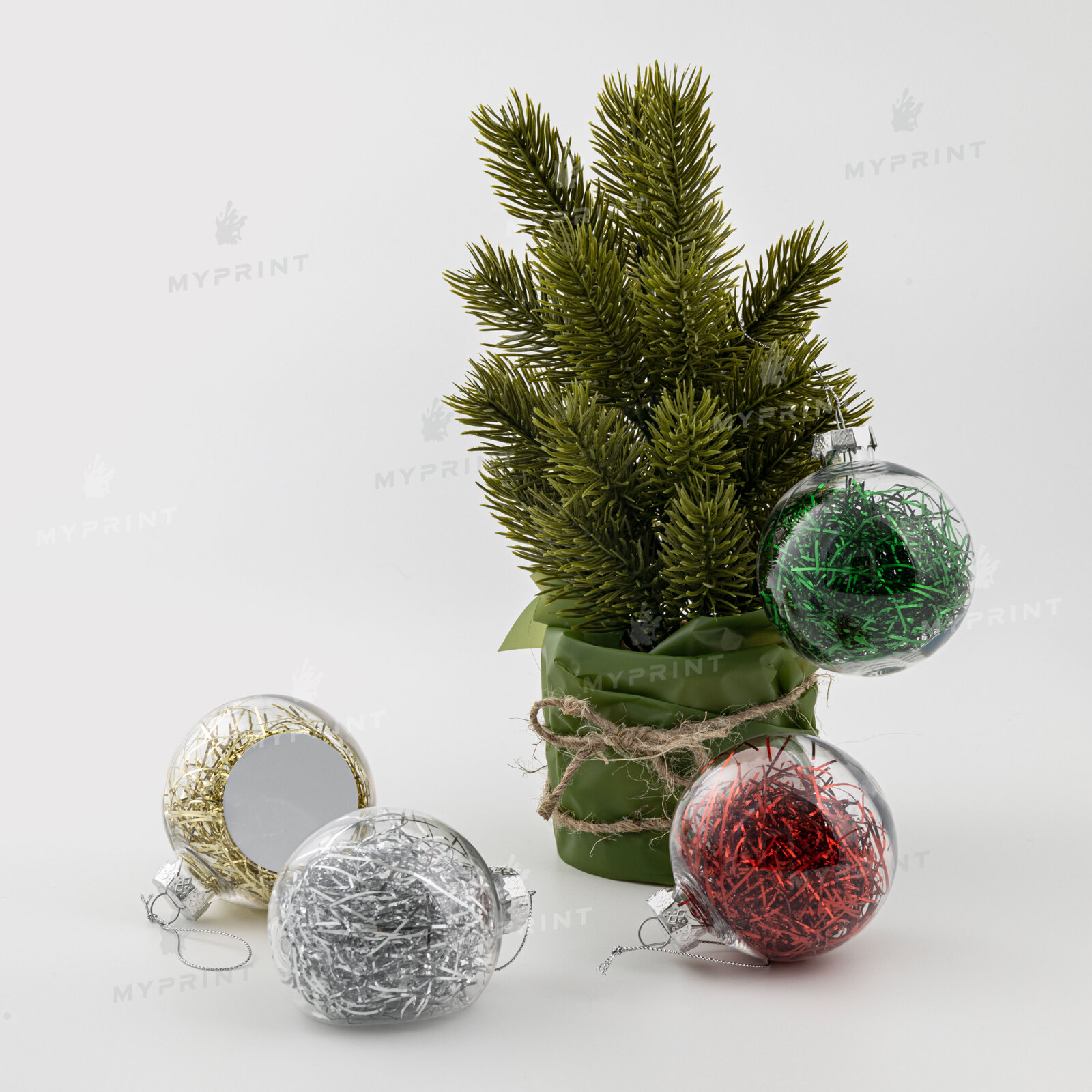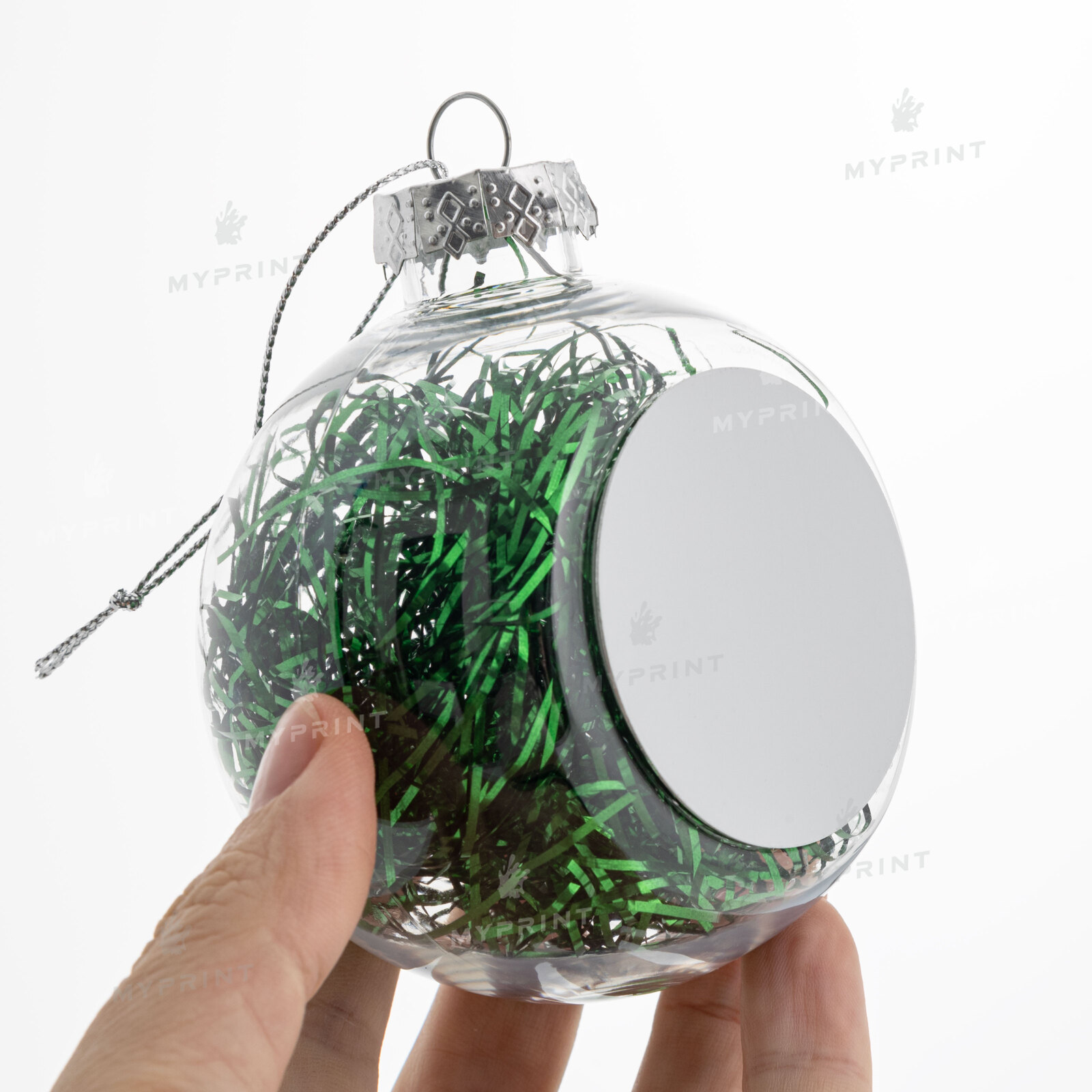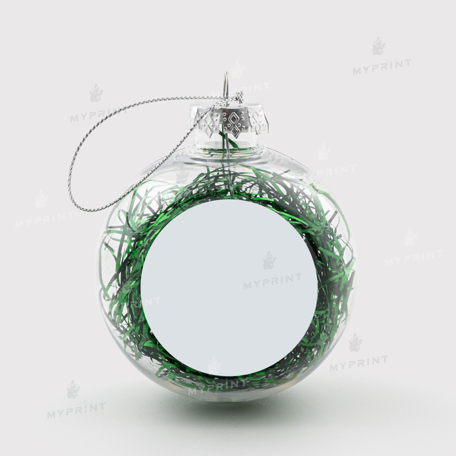 - Елочная игрушка для сублимации в форме шара с дождиком зеленая 8 см