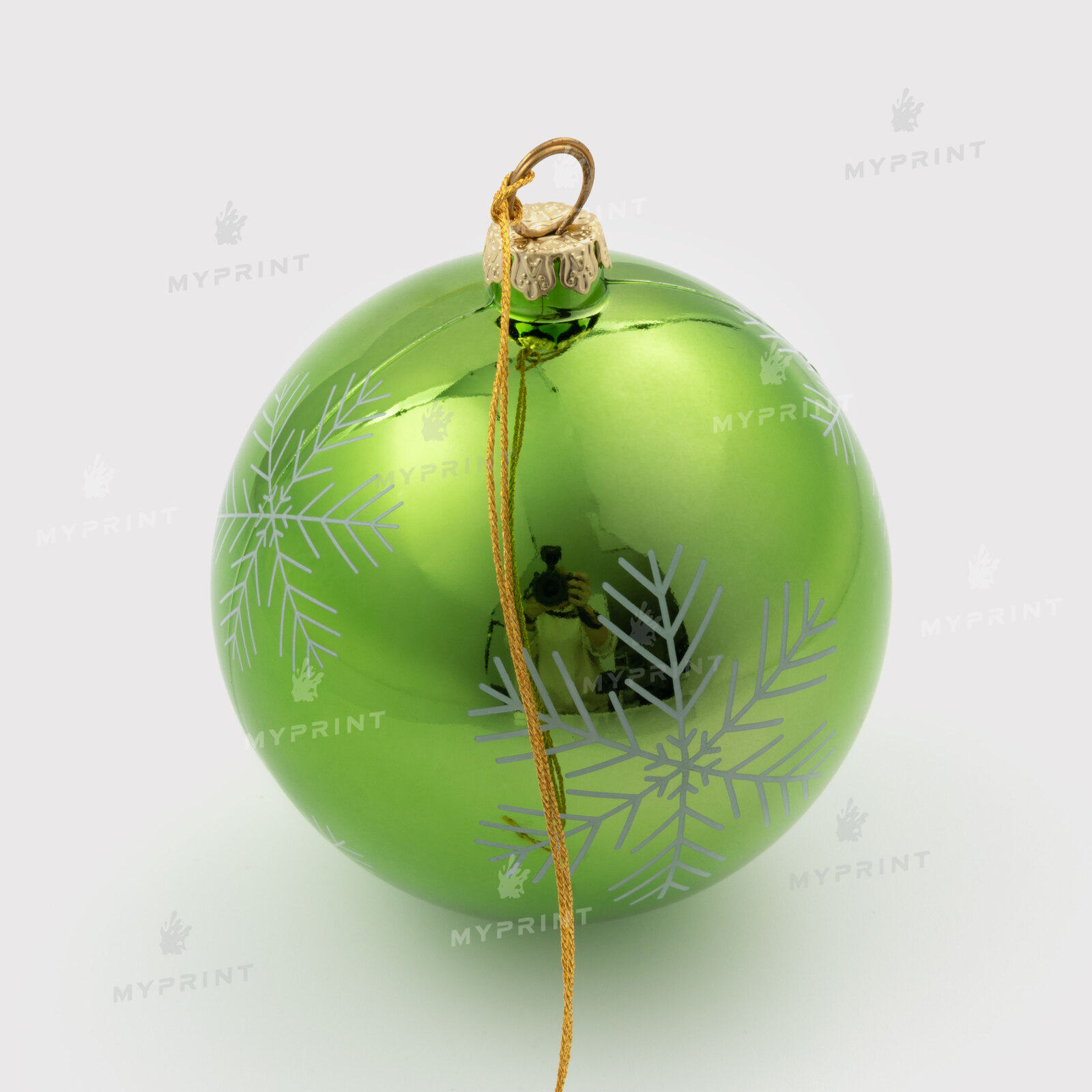 Процесс завершен. Елочная игрушка для сублимации в форме шара со снежинкой зеленая 8 см теперь не просто заготовка, а готовое изделие с уникальным изображением или фотографией.