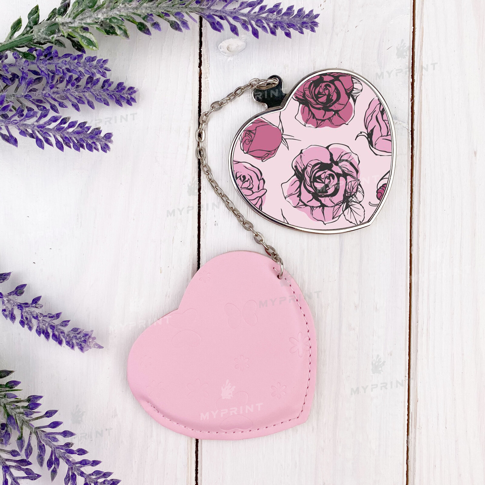 Процесс завершен. Зеркальце для сублимации металлическое в форме сердца в розовом чехле 6,3*6 см теперь не просто заготовка, а готовое изделие с уникальным изображением или фотографией.