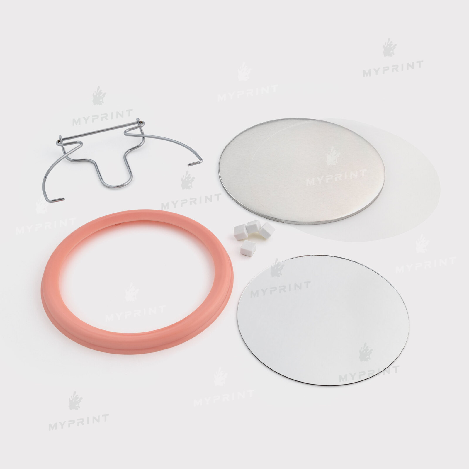 - В станок для значков с одной стороны кладем металлическую основу, вырезанное изображение и лавсановую пленку. С другой стороны кладем заднюю часть.