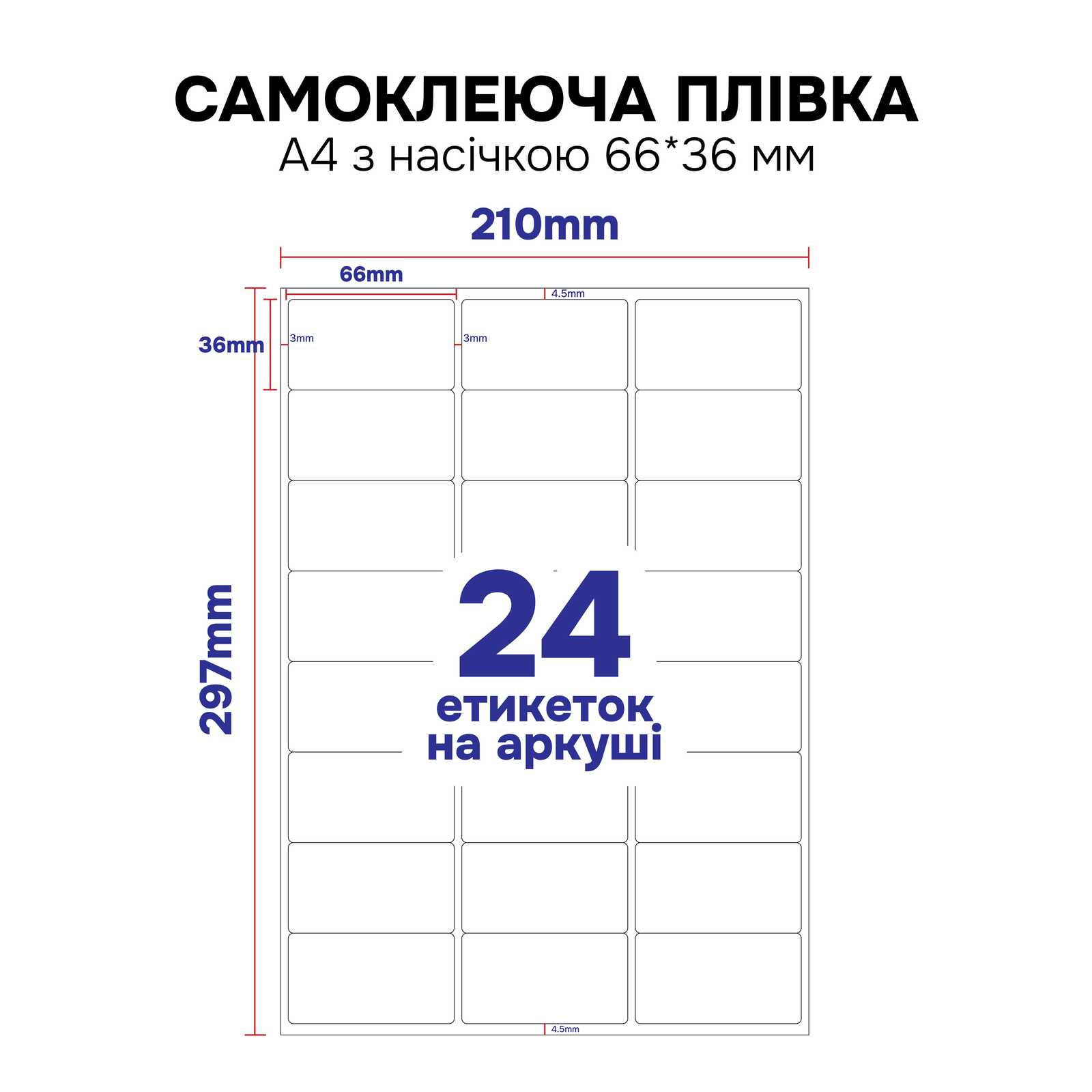 Характеристики Самоклеюча плівка для струменевого та лазерного друку My Print PP водостійка, А4 з насічкою 66*36 мм (24 шт.), 5 листів, матова біла (13040)
