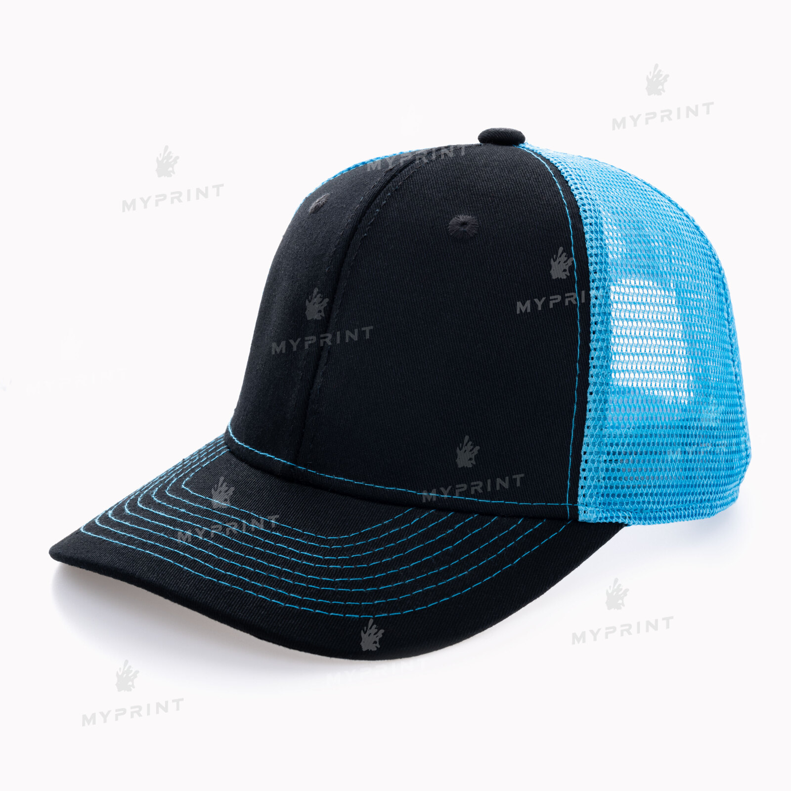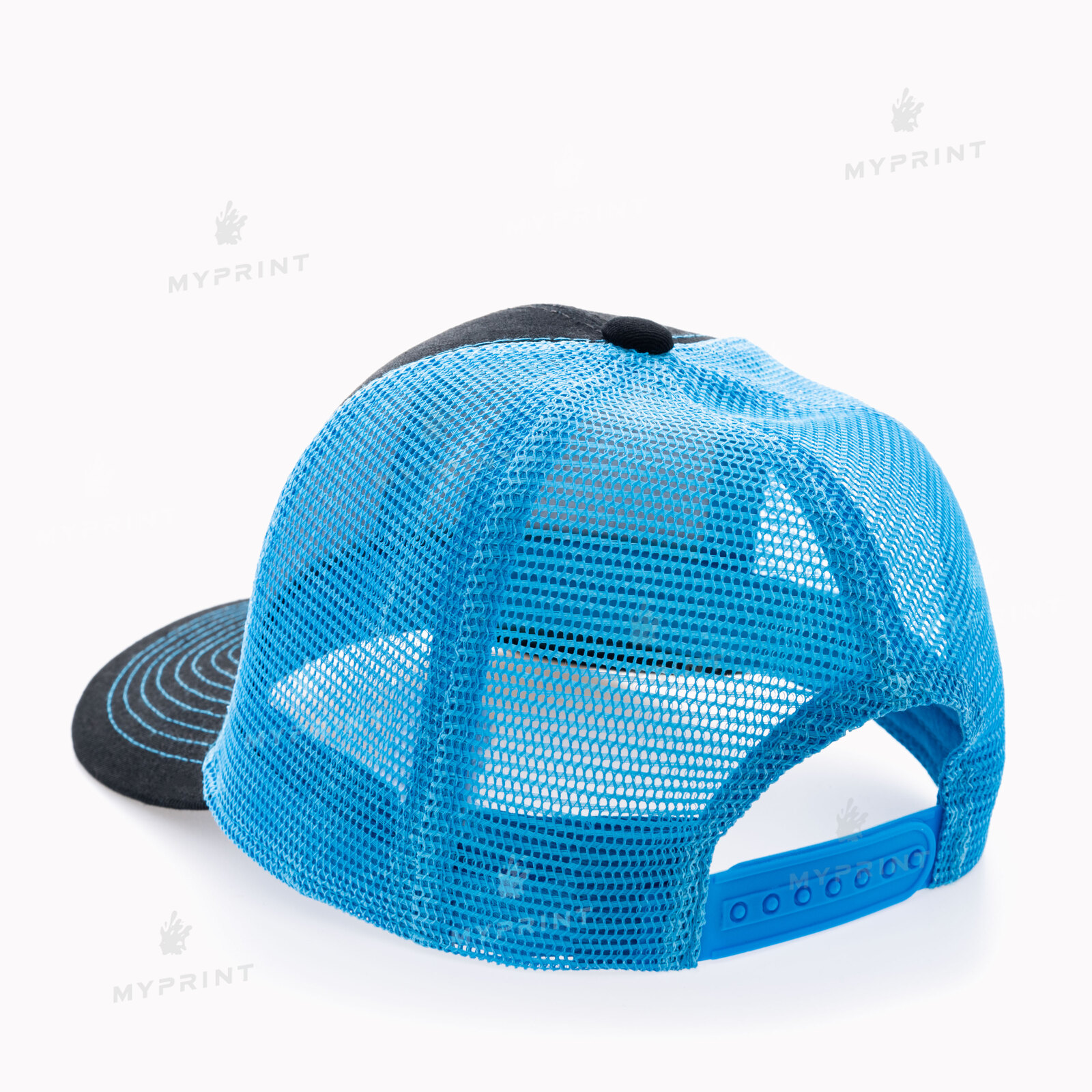 - Кепка шестиклинка для термотрансферу бавовняна чорна з блакитною сіткою.