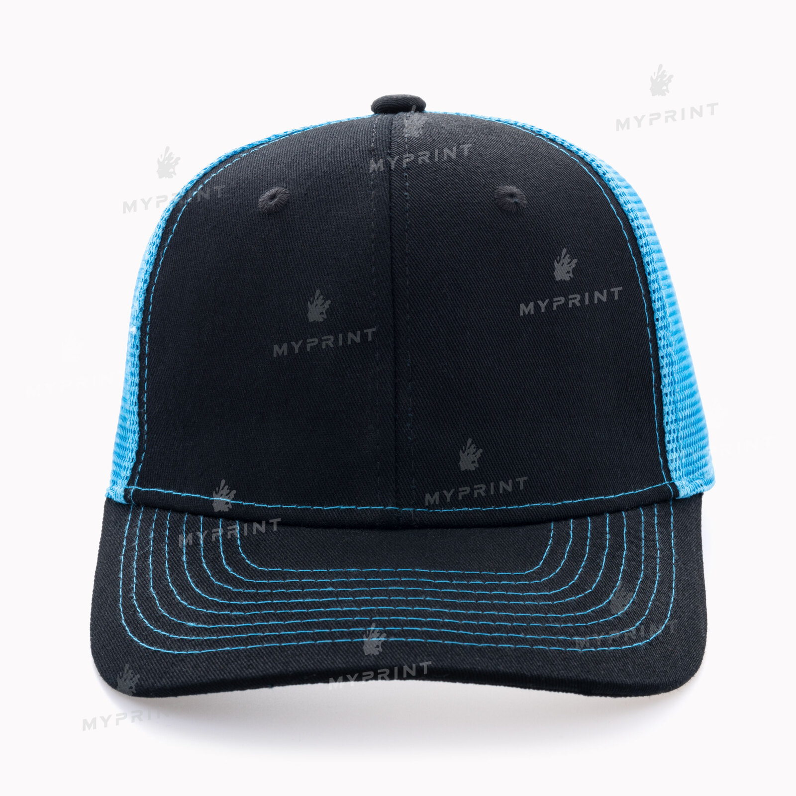 Нанести зображення на Кепка шестиклинка для термотрансферу бавовняна чорна з блакитною сіткою можна методом DTF друку та термотрансферу.