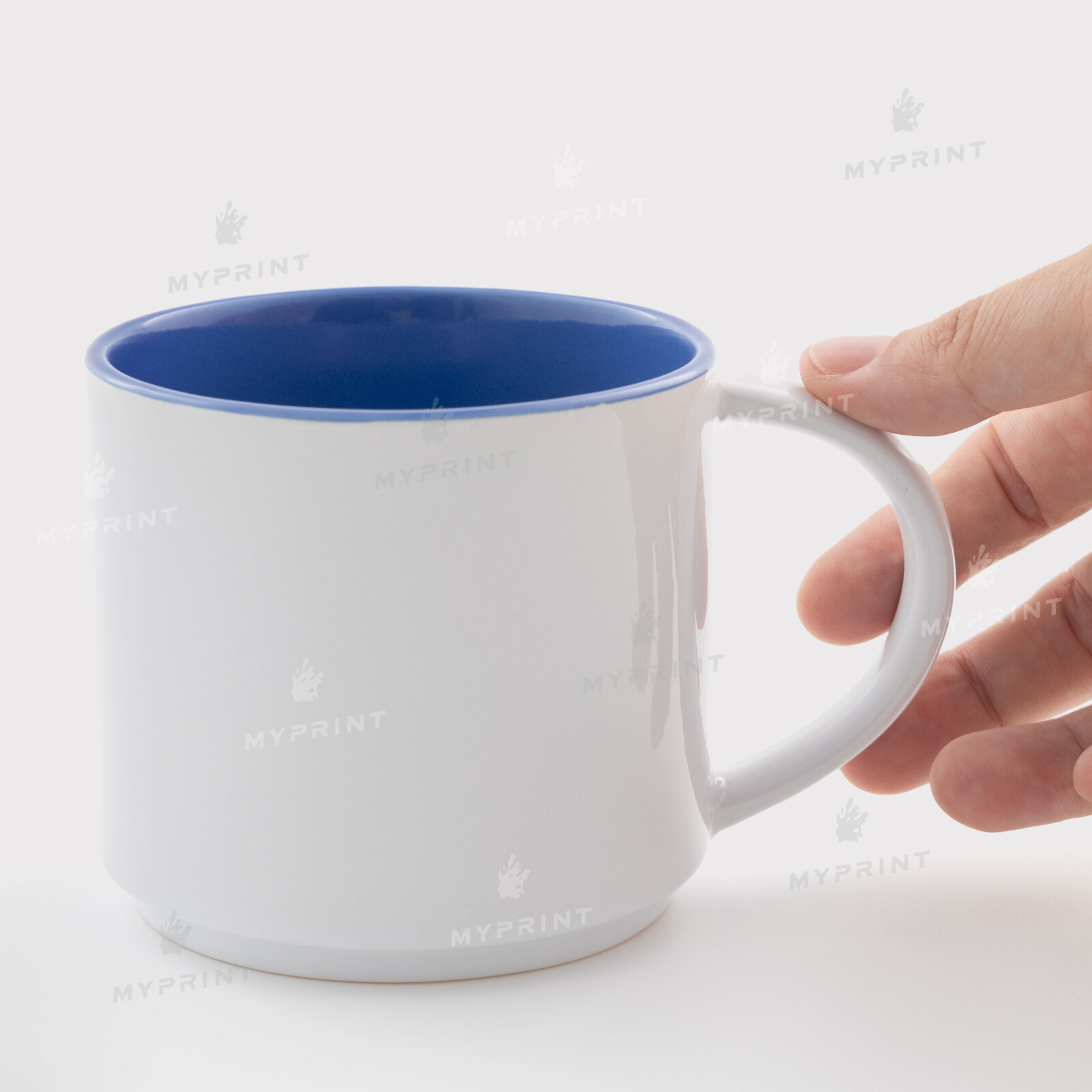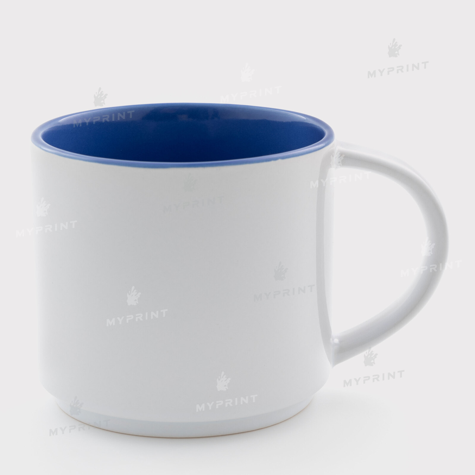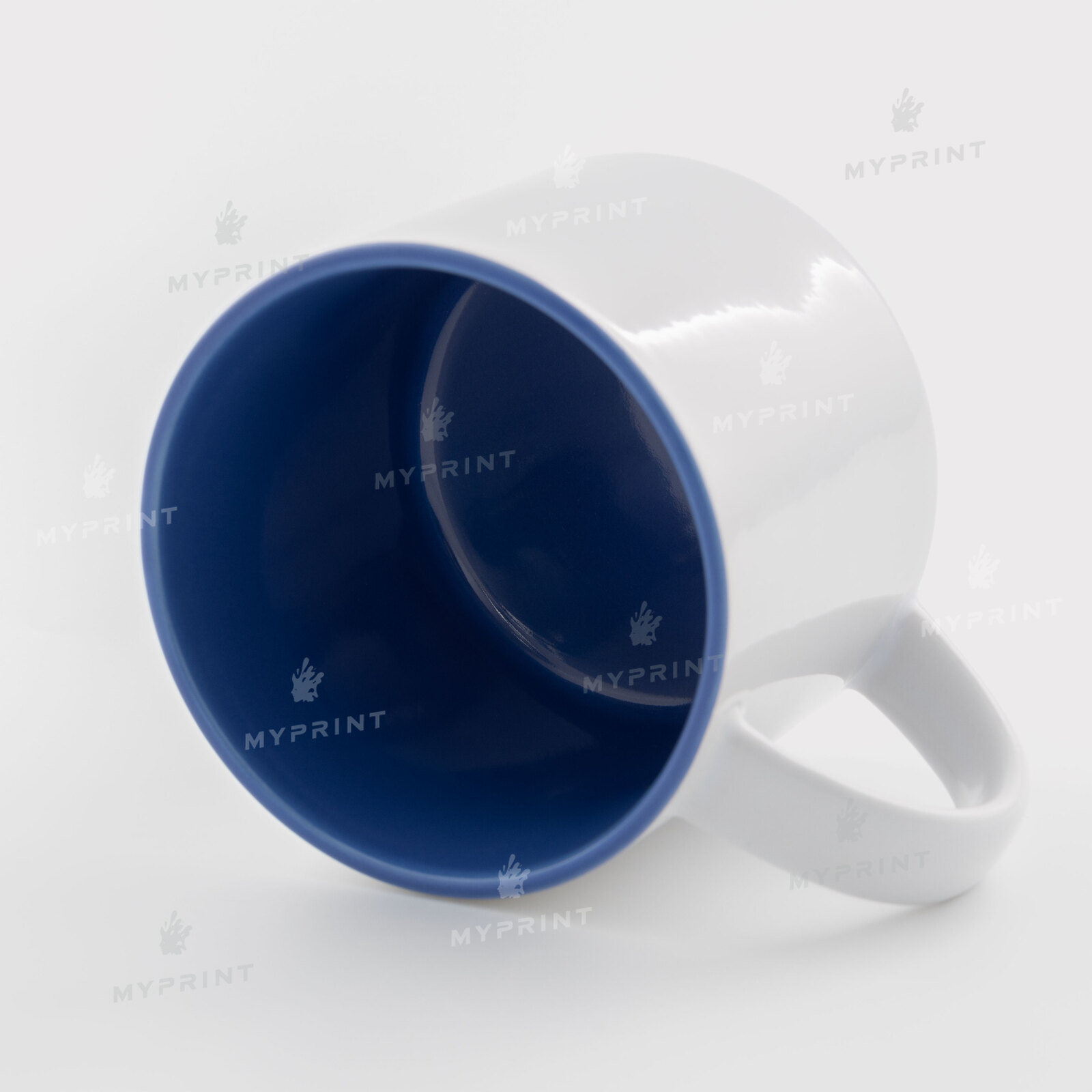 Процес завершено. Чашка для сублімації кольорова всередині, яка складається одна на іншу синя (450 мл) тепер це не просто заготовка, а готовий виріб з унікальним зображенням або фотографією.