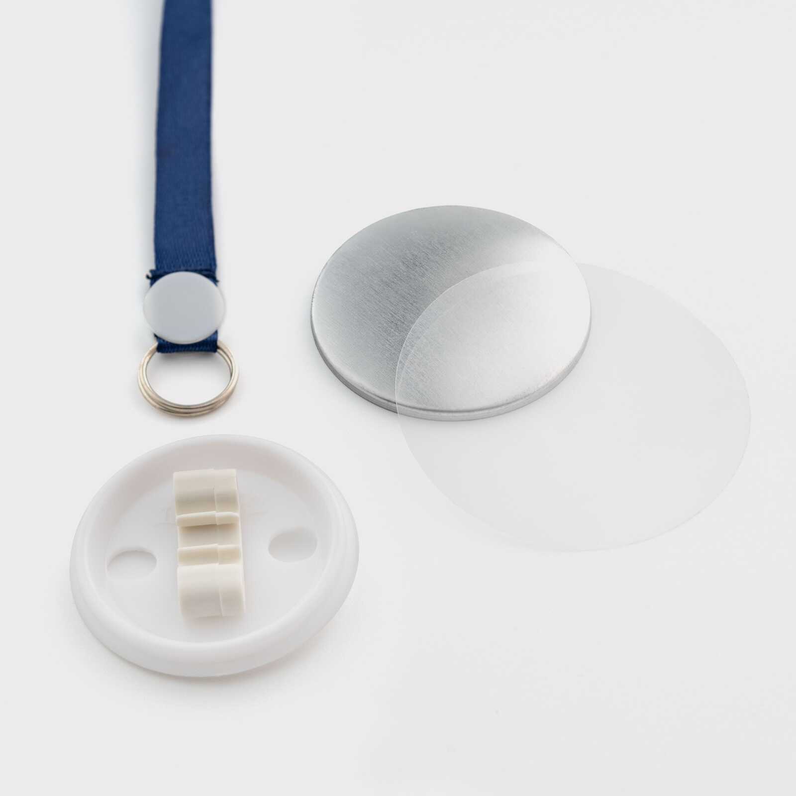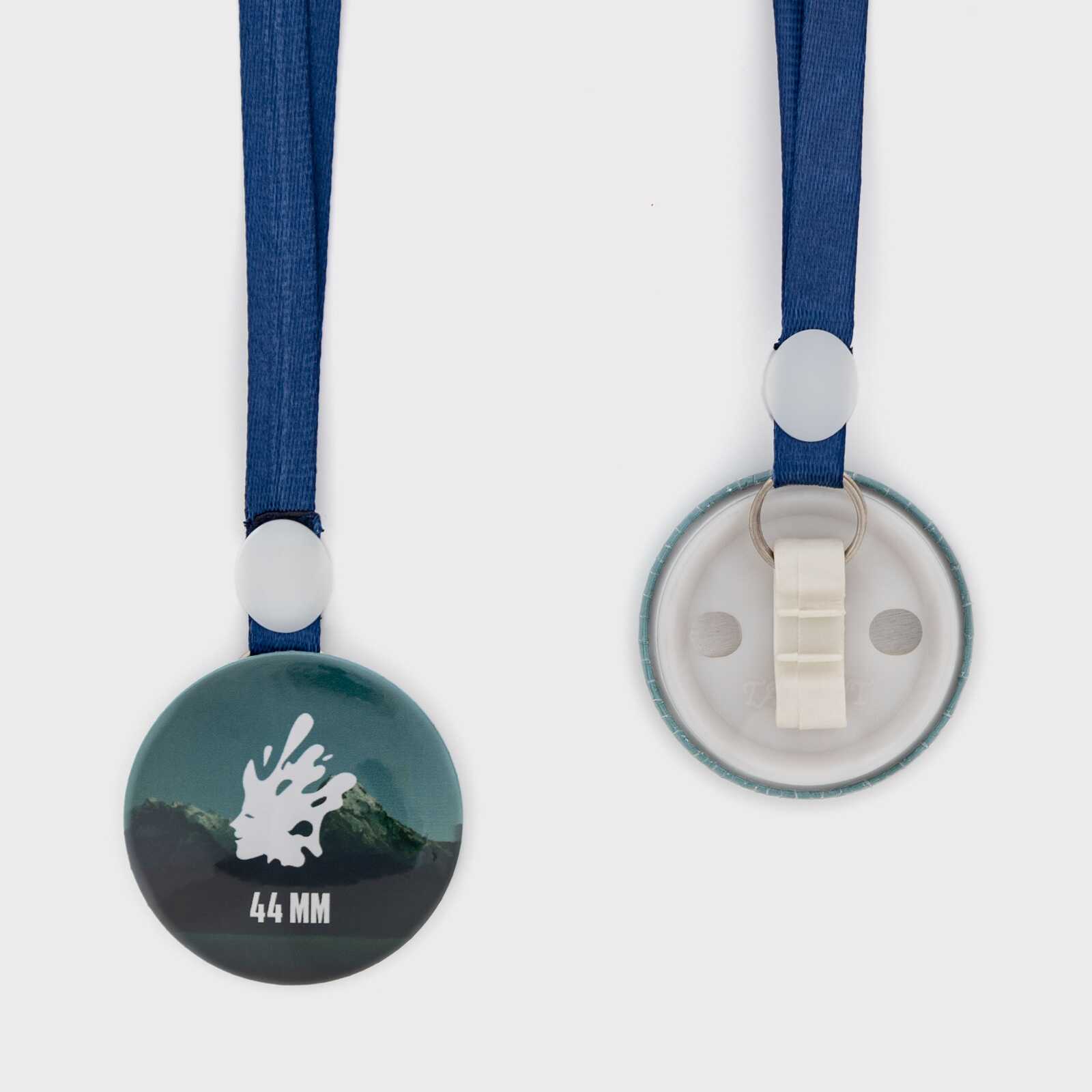 Процес завершено. Заготовка для закатної медалі 44 мм з синьою стрічкою тепер готовий виріб з унікальним зображенням або фотографією.