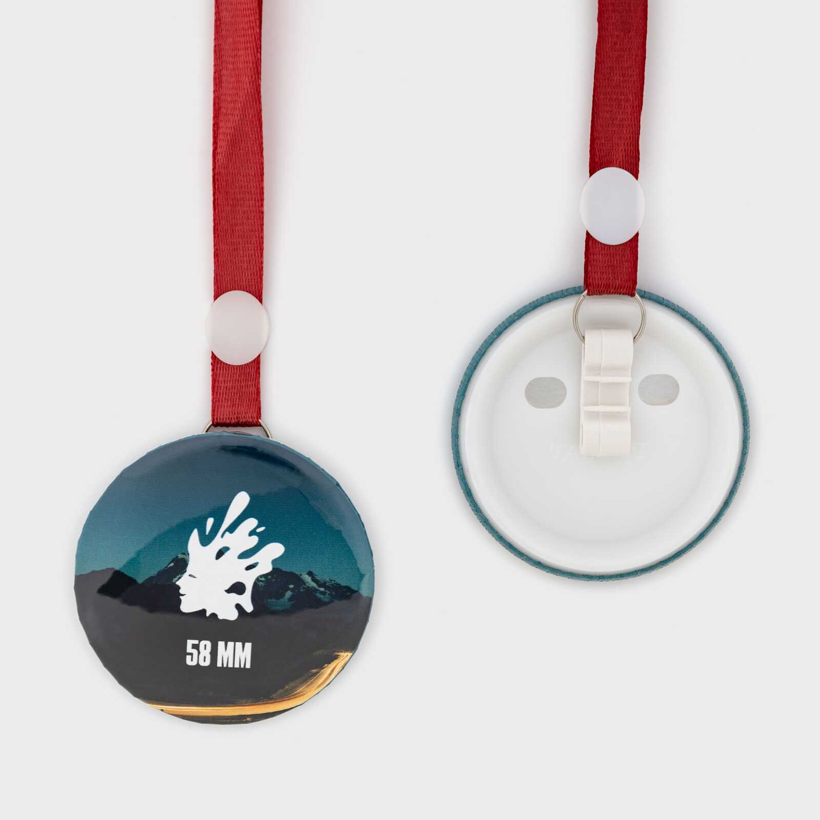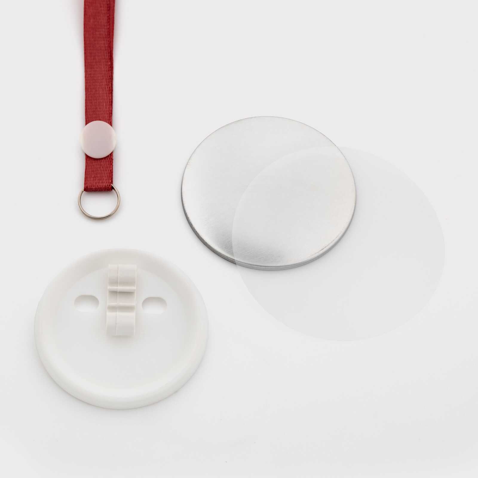 Процес завершено. Заготовка для закатної медалі 58 мм з бордовою стрічкою тепер готовий виріб з унікальним зображенням або фотографією.