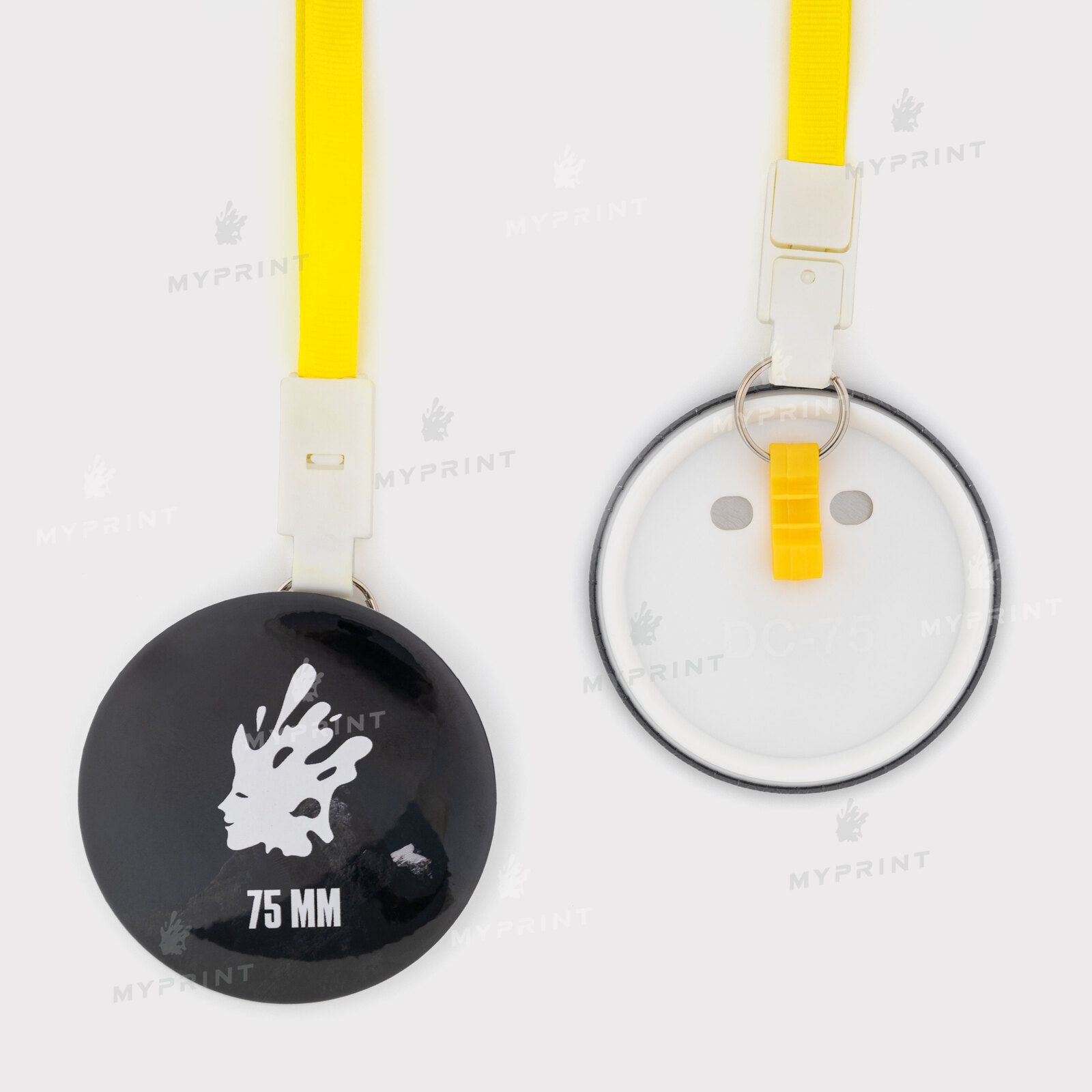 Процес завершено. Заготовка для закатної медалі 75 мм з жовтою стрічкою My Print ptb75 тепер готовий виріб з унікальним зображенням або фотографією.